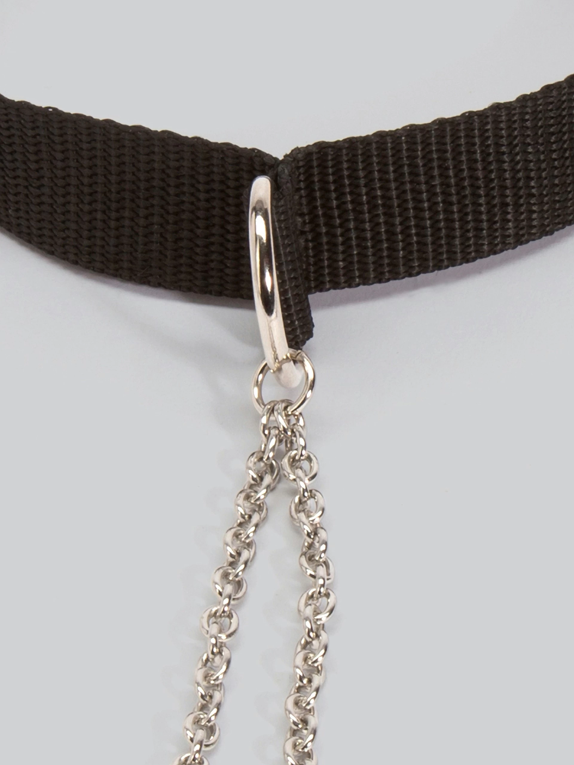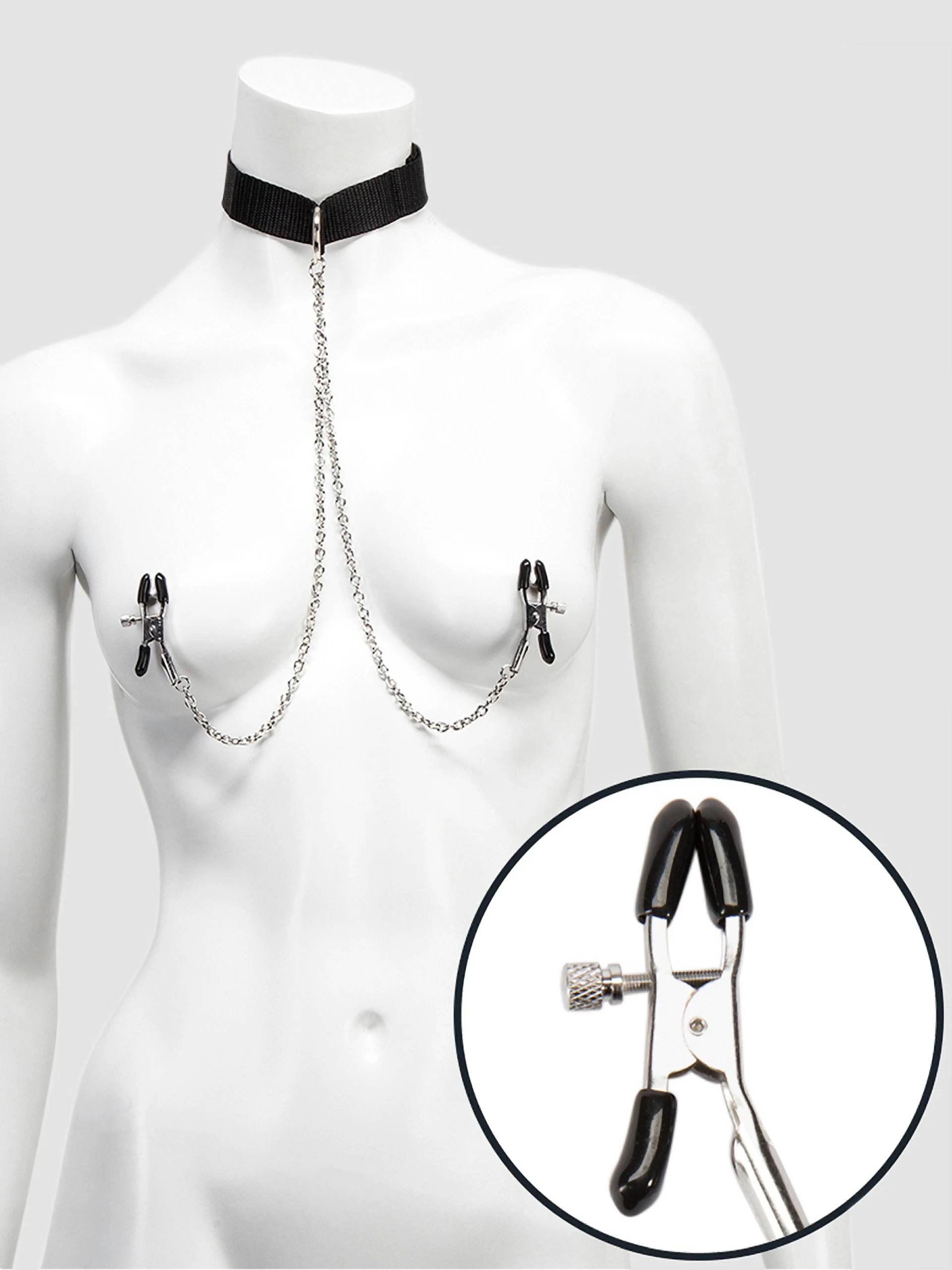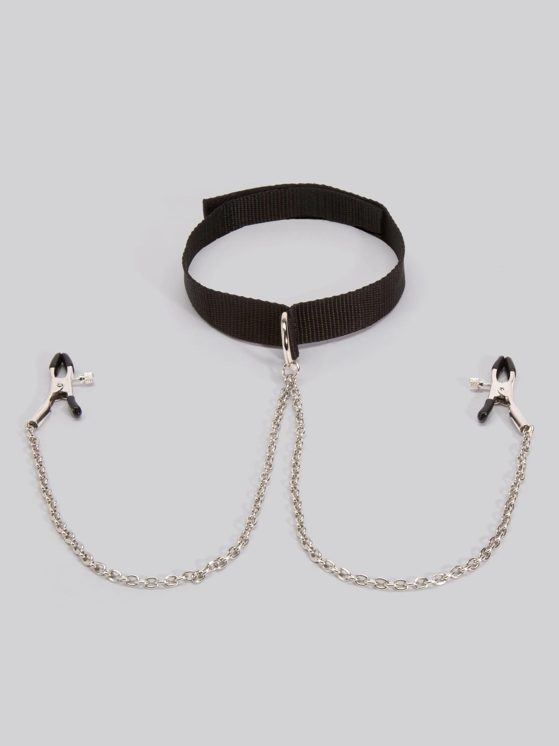 Possess your partner like a prize pet with this black bondage collar. A handy D-ring is ideal for teaming with a lead and also features 2 metal chains with nipple clamps, ready to snap onto nipples for the irresistible combination of pleasure and pain.