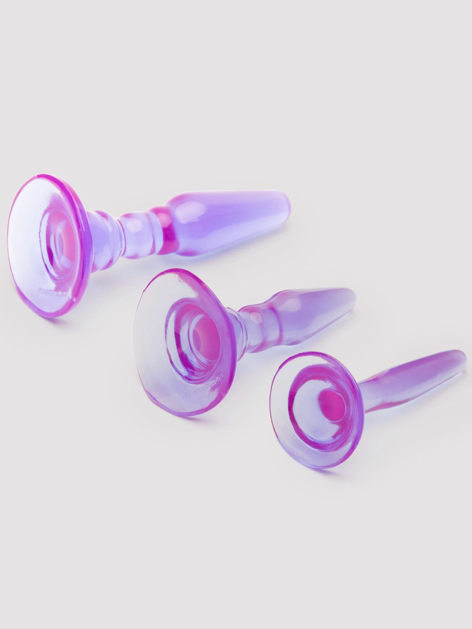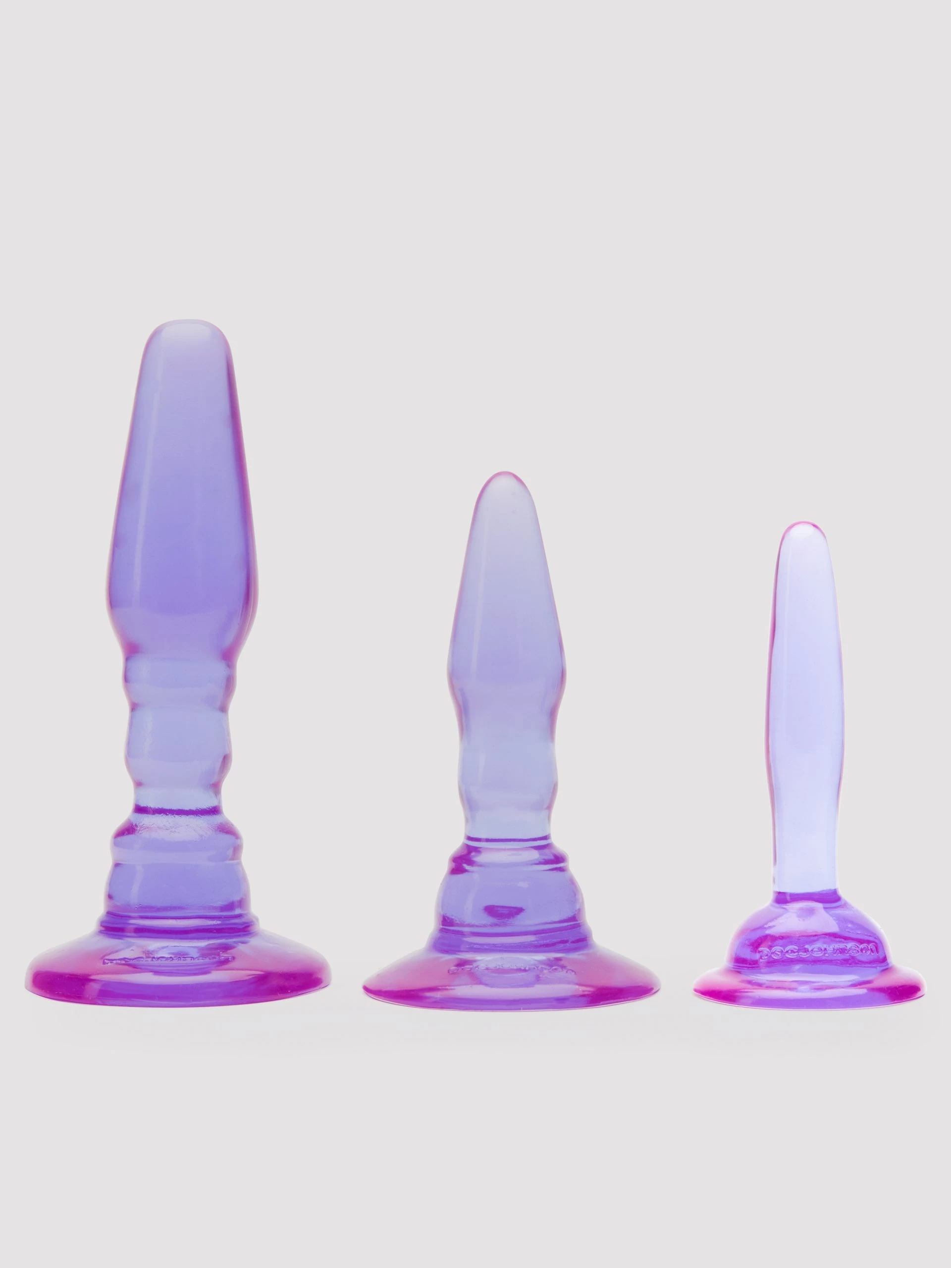 Each plug is smooth and tapered for easy insertion, and features a sturdy flared suction base for safety and hands free possibilities. Explore all 3 plugs, starting with the slender, smooth beginner’s plug first. When you’re ready to progress, move onto the textured medium plug, and finally the large bulbous plug to finish your journey.