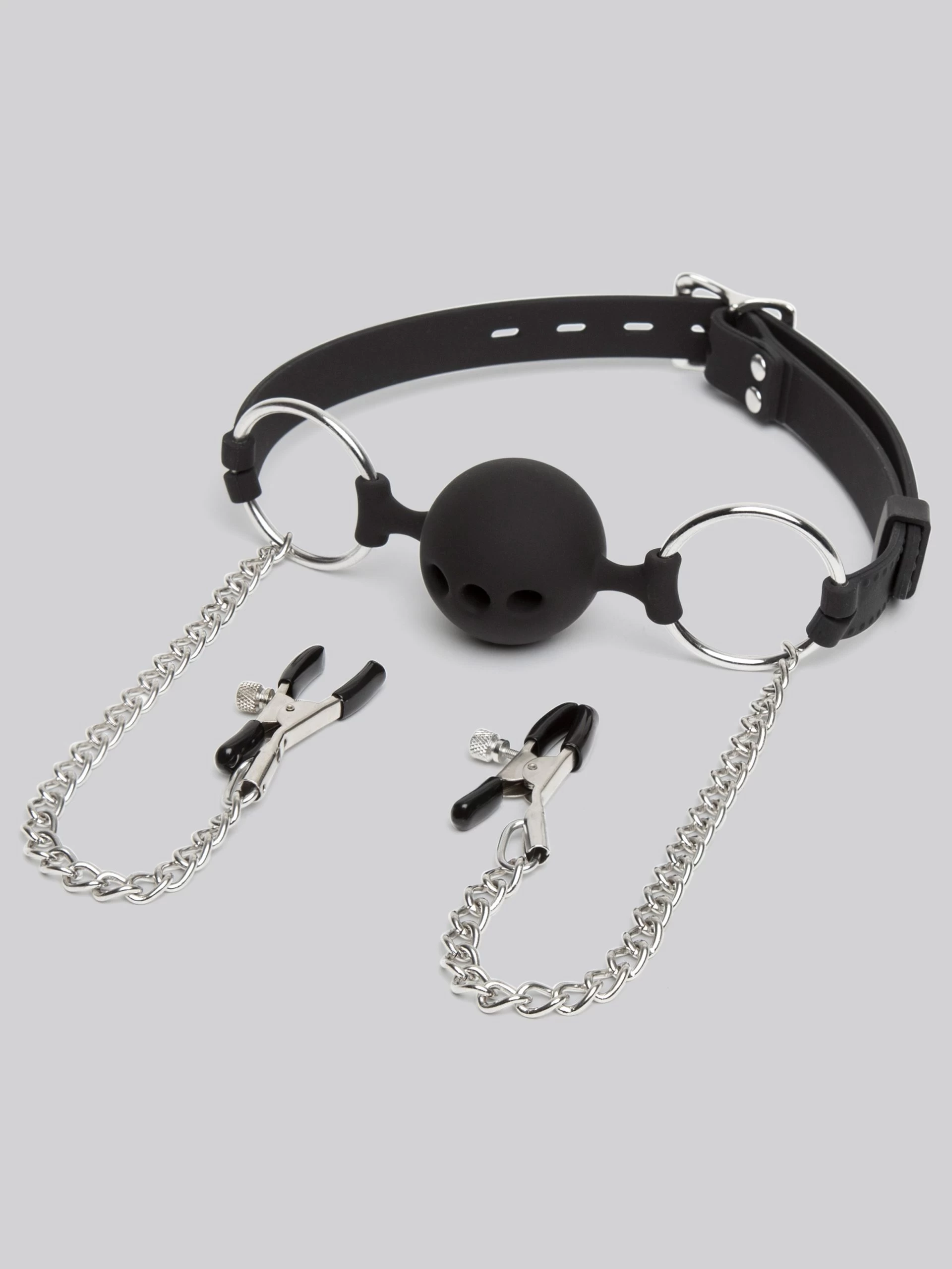 Hypoallergenic and fully adjustable, the silicone straps offer a snug, reliable fit, while the lockable buckle fastening makes extreme restraint straightforward. Crocodile-style nipple clamps hang from strong chains and adjust with a simple screw-pin for tailored tension. Connecting the straps and ball gag are two oversized O-rings – perfect for attaching your choice of restraints, chains and leads to.
