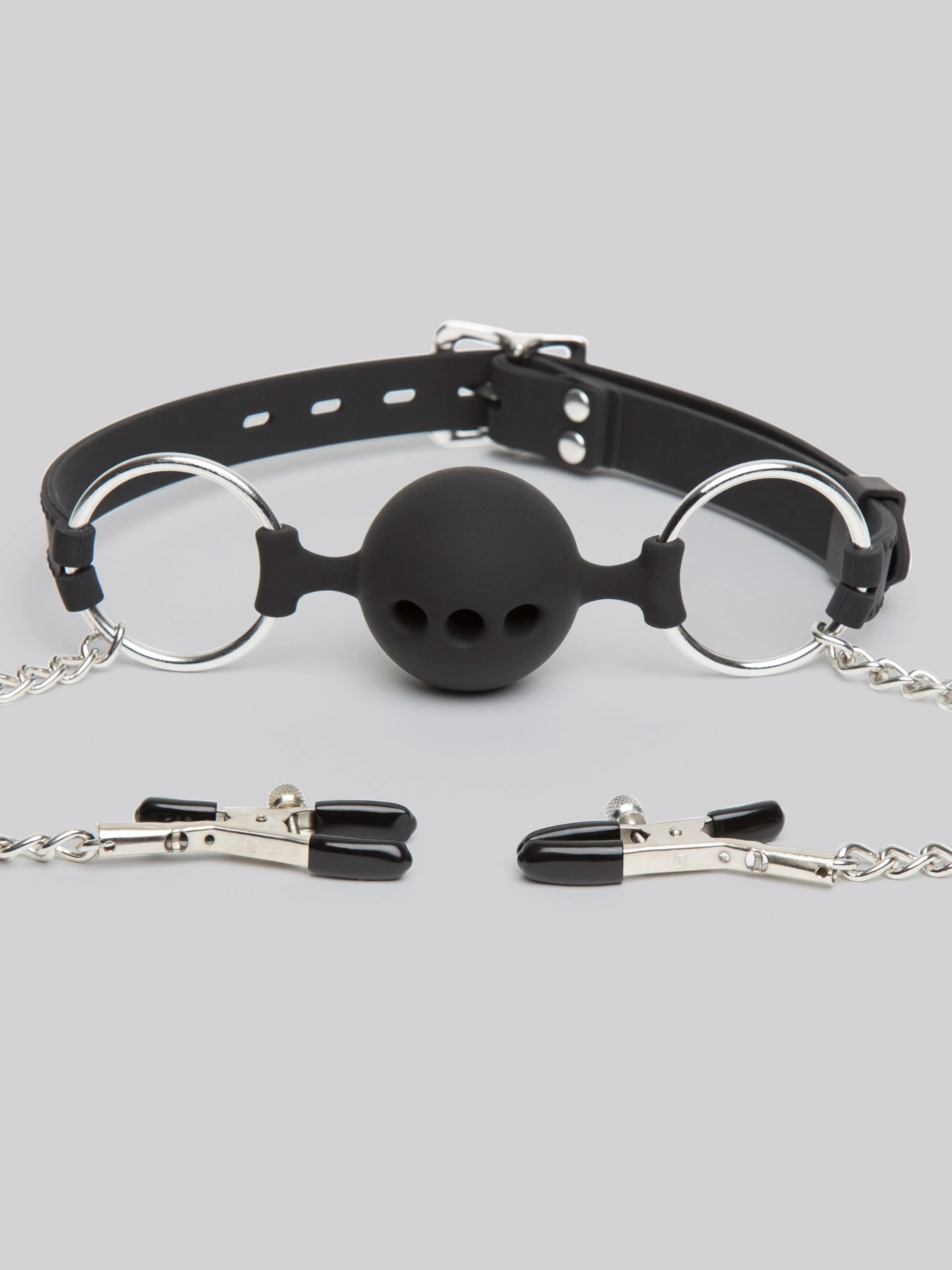 Take your BDSM pleasures to the next level with this breathable ball gag and nipple clamp set. Made from smooth velvety silicone and fully adjustable, use it to silence your lover and stimulate their nipples for utterly satisfying domination play.