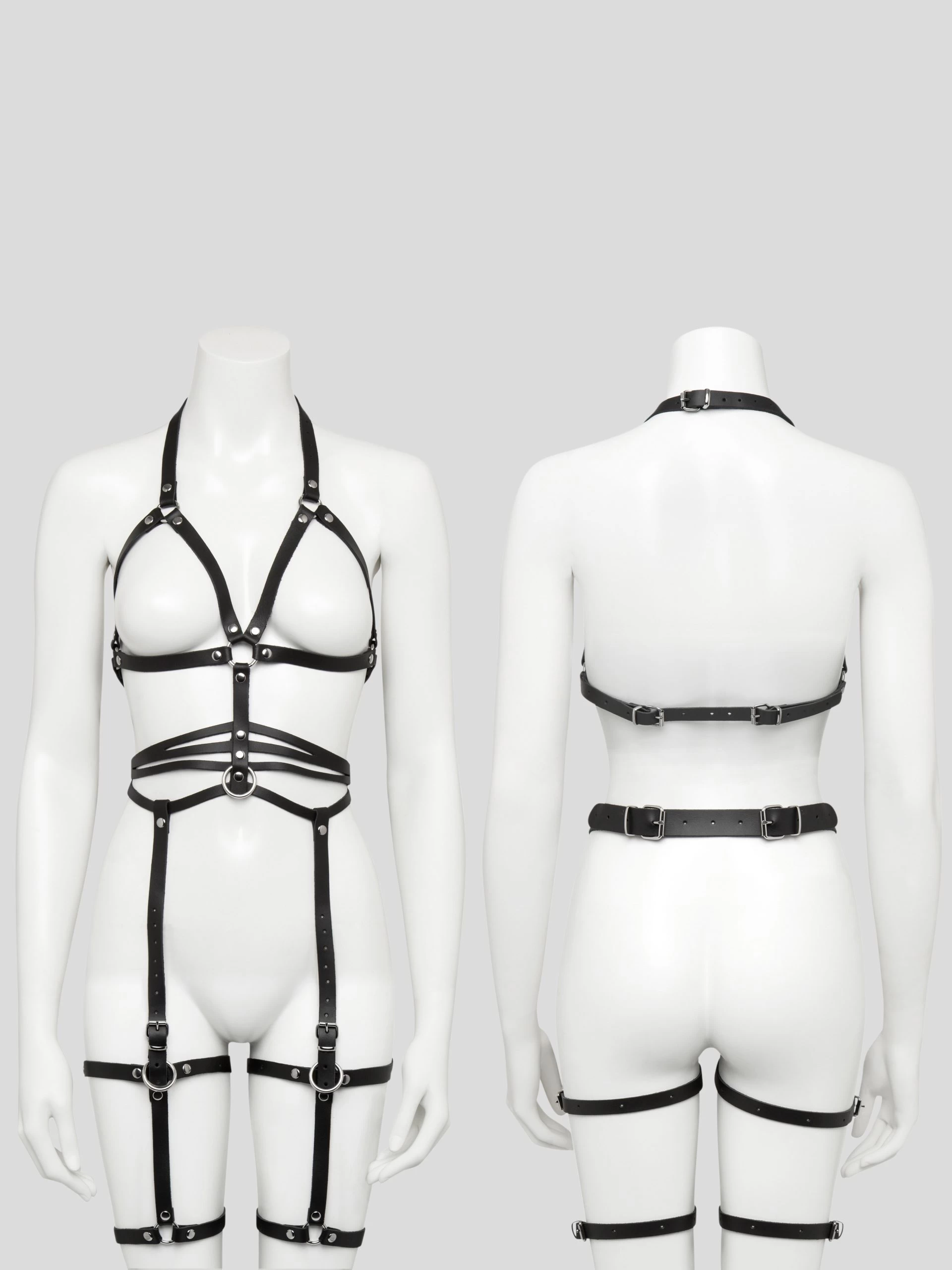 - Leather strapped body harness with O-rings for enhancing bondage play