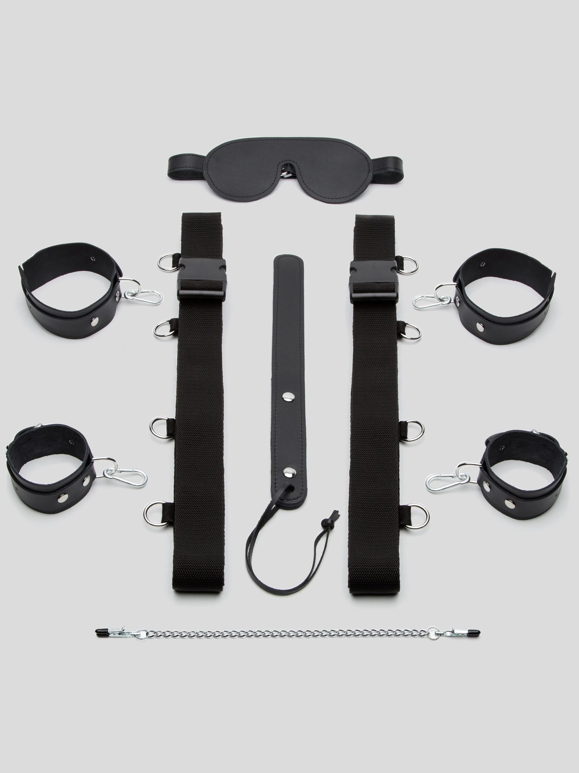 A variation on one of our most popular bondage sets, this under mattress restraint kit comes with everything you need for BDSM play. Enjoy 4-poster style restraint on any bed and play using the blindfold, advanced spanking paddle and nipple clamps.