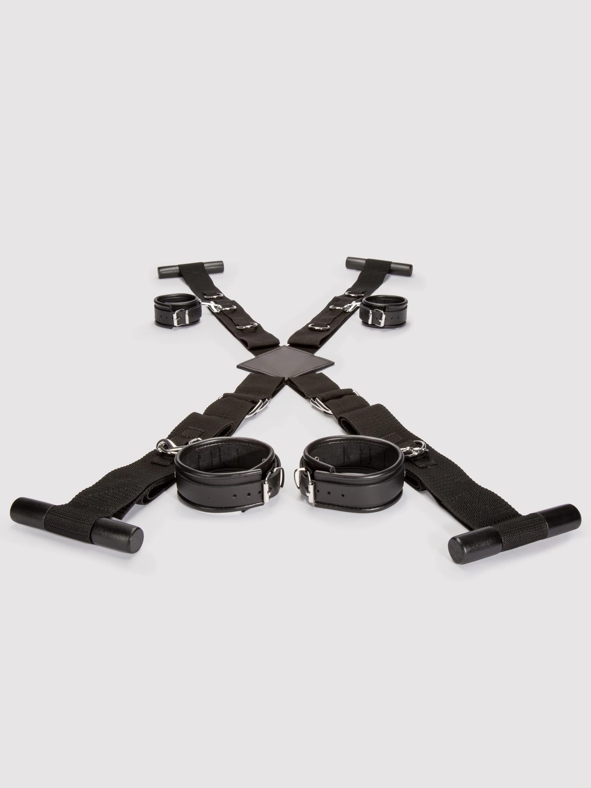 Turn horizontal refreshment into a vertical vacation with this sturdy over-the-door restraint. Affixing over any internal door with four strong barbells, it easily adjusts to suit any height and keeps limbs spread for orgasmic play while standing.