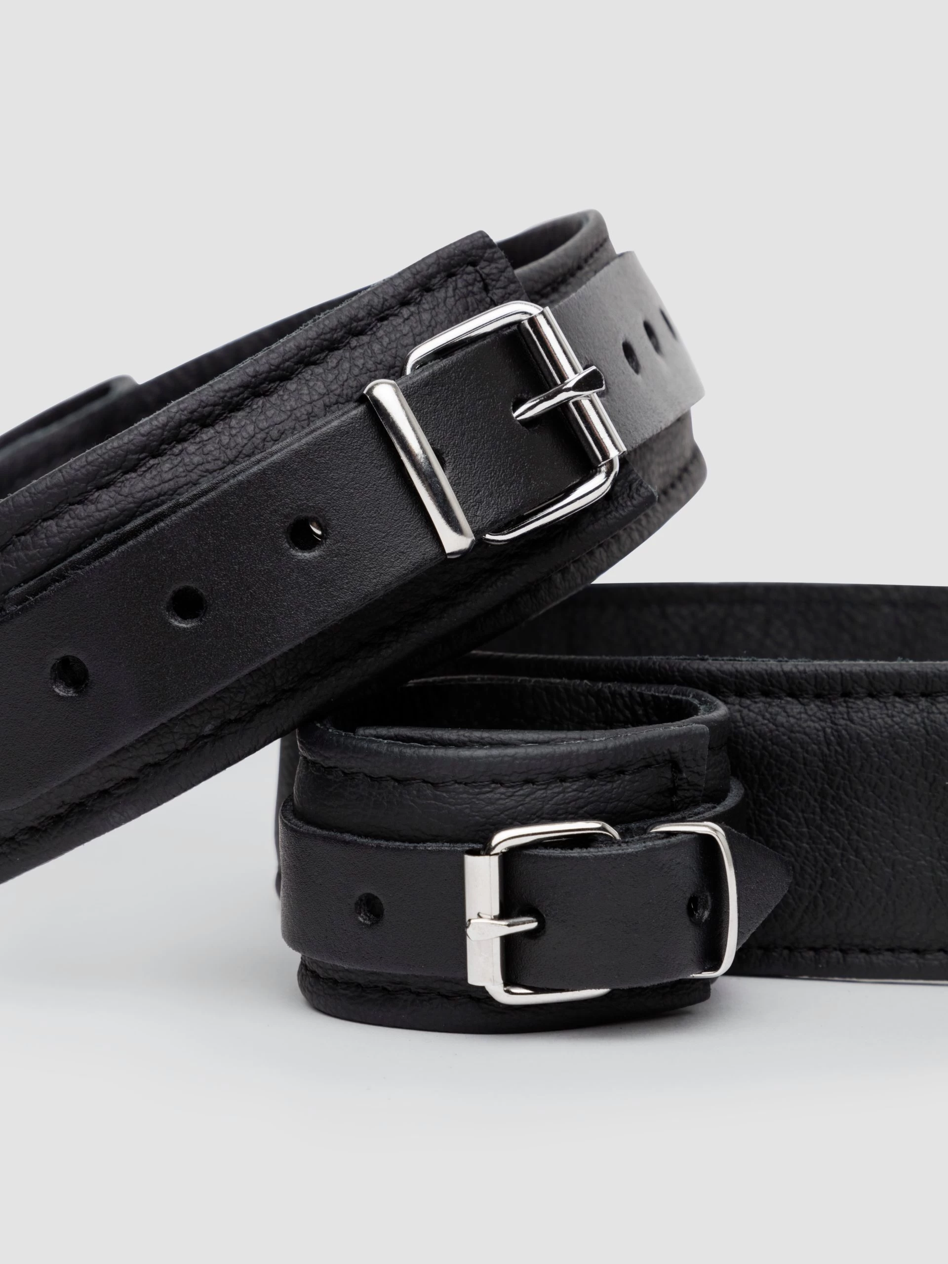 - Padded leather wrist-to-thigh restraints for exciting bondage play
