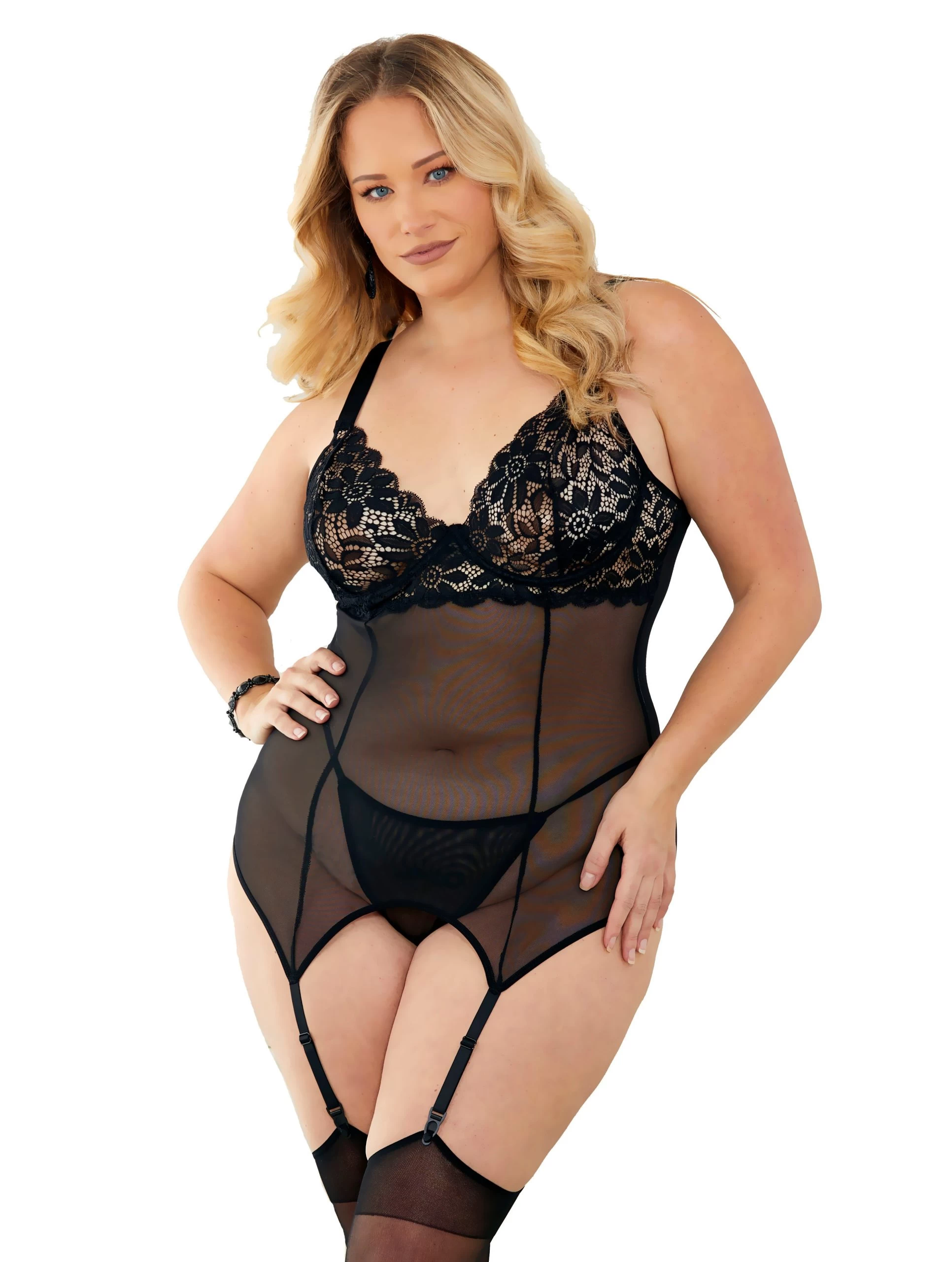 A short hemline and adjustable suspender straps make this the perfect lingerie choice for pairing with the included stockings and some killer heels.