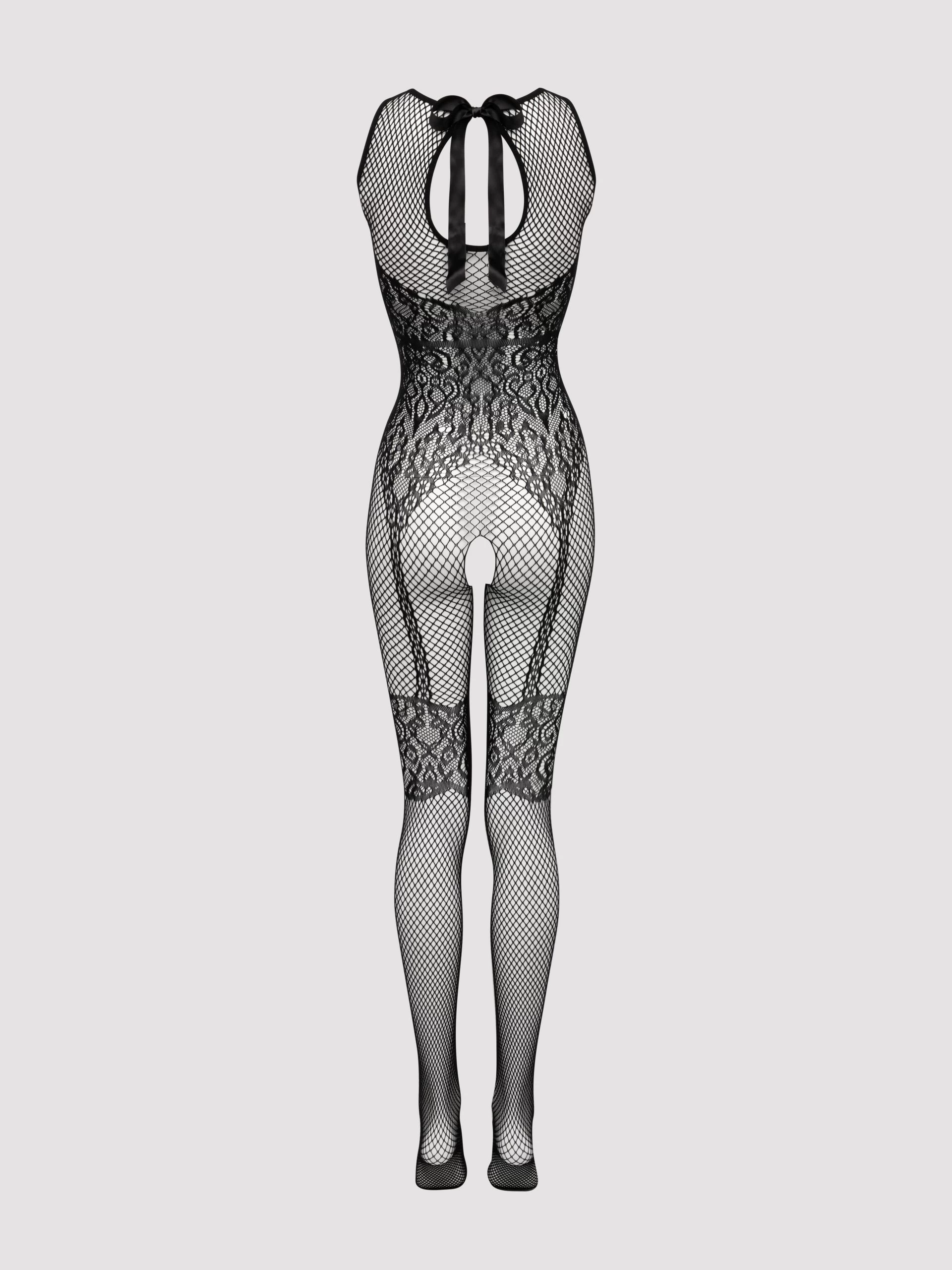 Treat yourself to the look of a basque with the easy elegance of a bodystocking. Caressing your curves from throat to toe, the combo of lace and fishnet emphasizes your best bits, while the ties to the rear reveal a tempting keyhole opening.