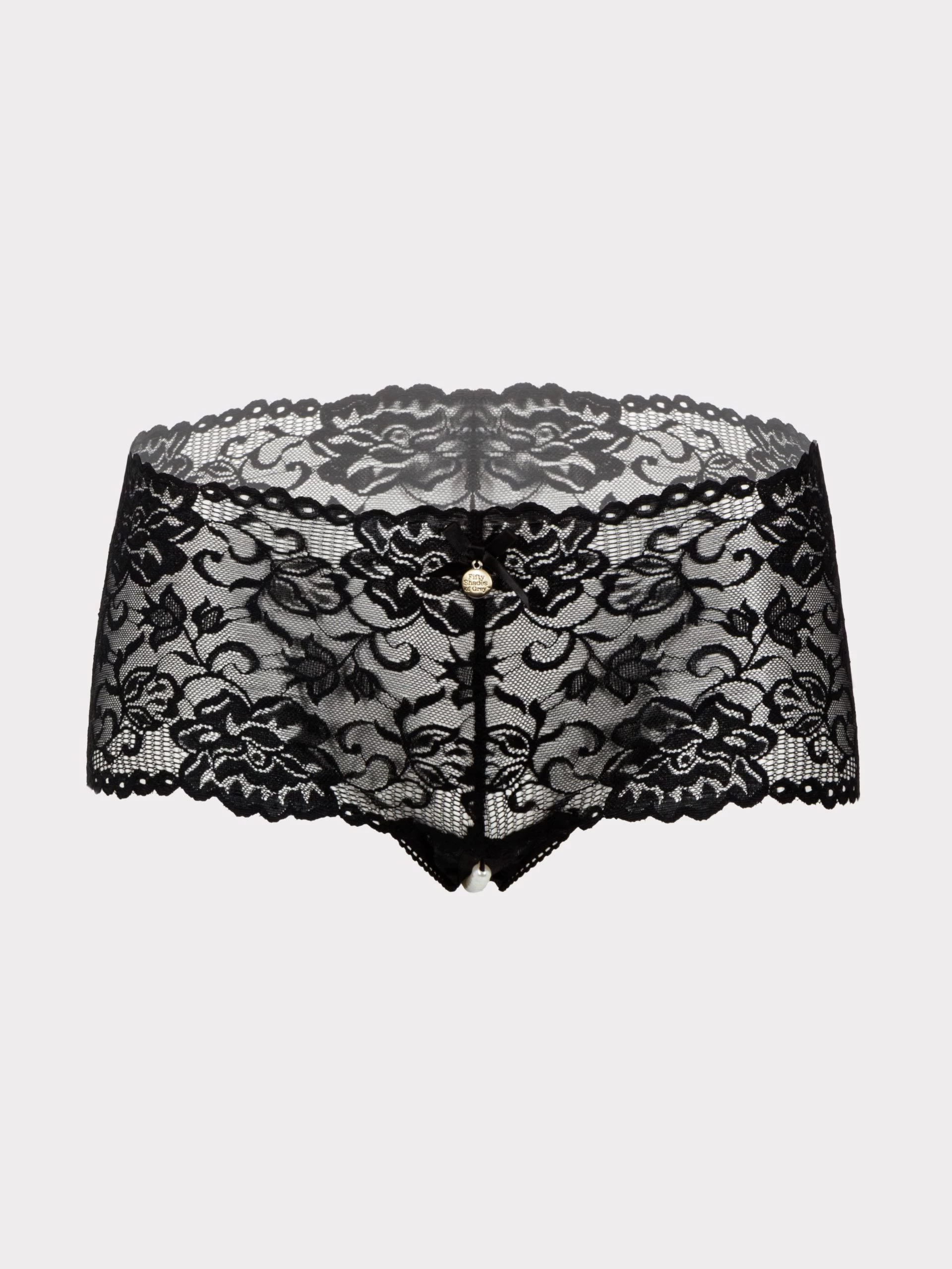 - Crotchless lace shorts with pearl-like beads across the gusset for secret stimulation