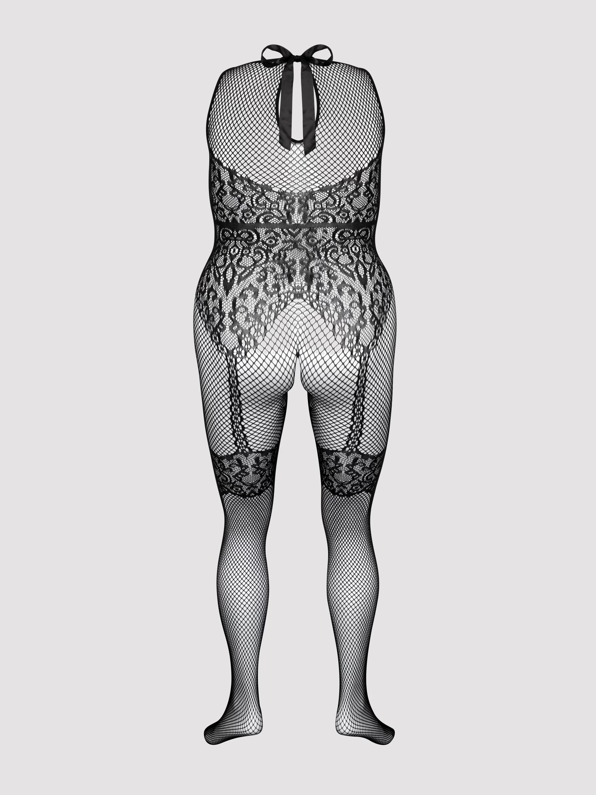 Treat yourself to the look of a basque with the easy elegance of a bodystocking. Caressing your curves from throat to toe, the combo of lace and fishnet emphasizes your best bits, while the ties to the rear reveal a tempting keyhole opening.