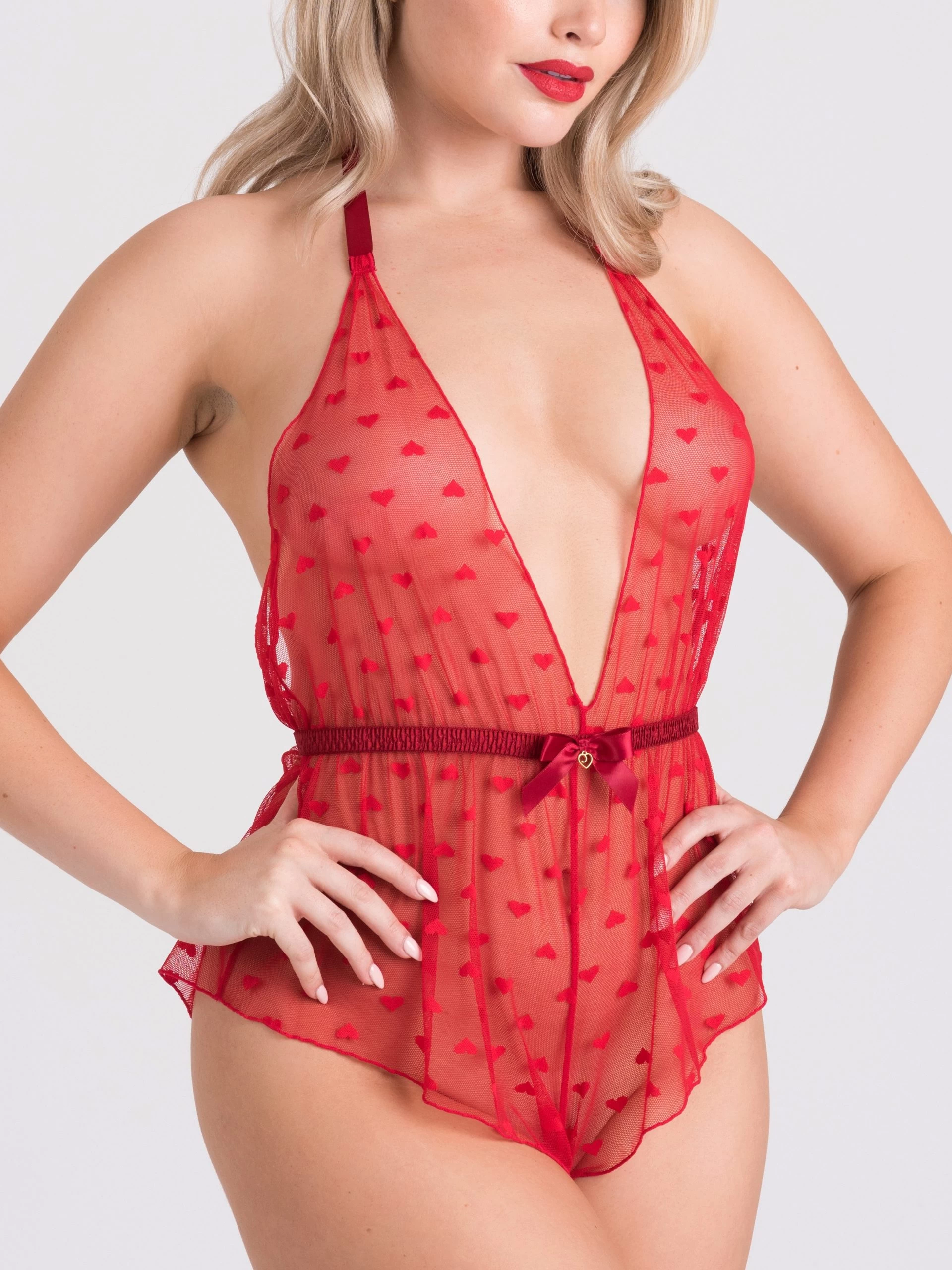 Forget wearing them on your sleeve, wearing hearts all over your body is way sexier. Cut high on the leg to leave your lover wanting more, this sizzling scarlet teddy plunges to your navel, whetting their appetite for the wild night ahead.