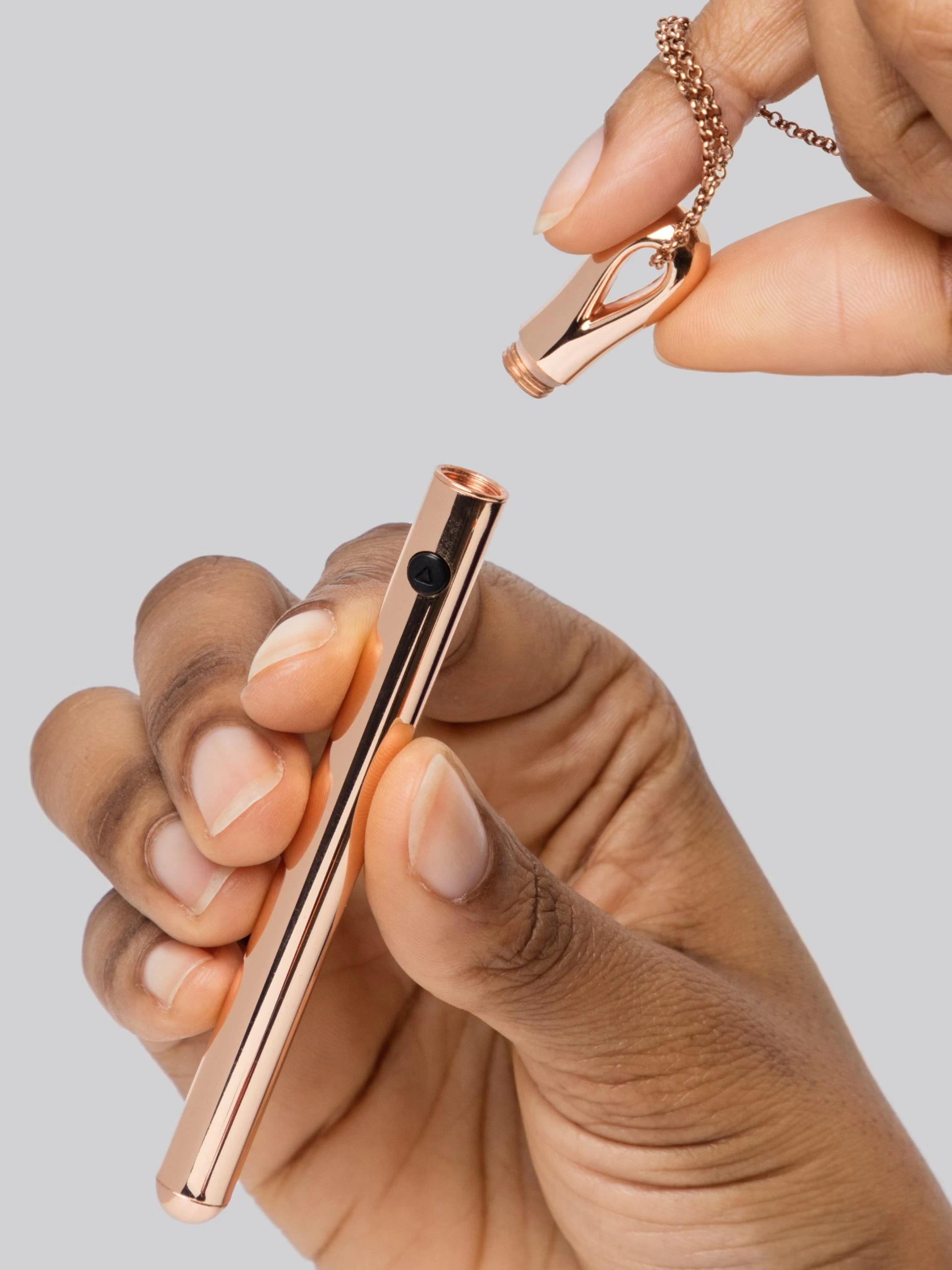 For fashion that’s the perfect complement to your passion, look no further than this gorgeous rose gold-colored necklace. Housing a teeny vibrator teeming with mighty vibes, it’s a statement piece that means your own power to please is always at hand.