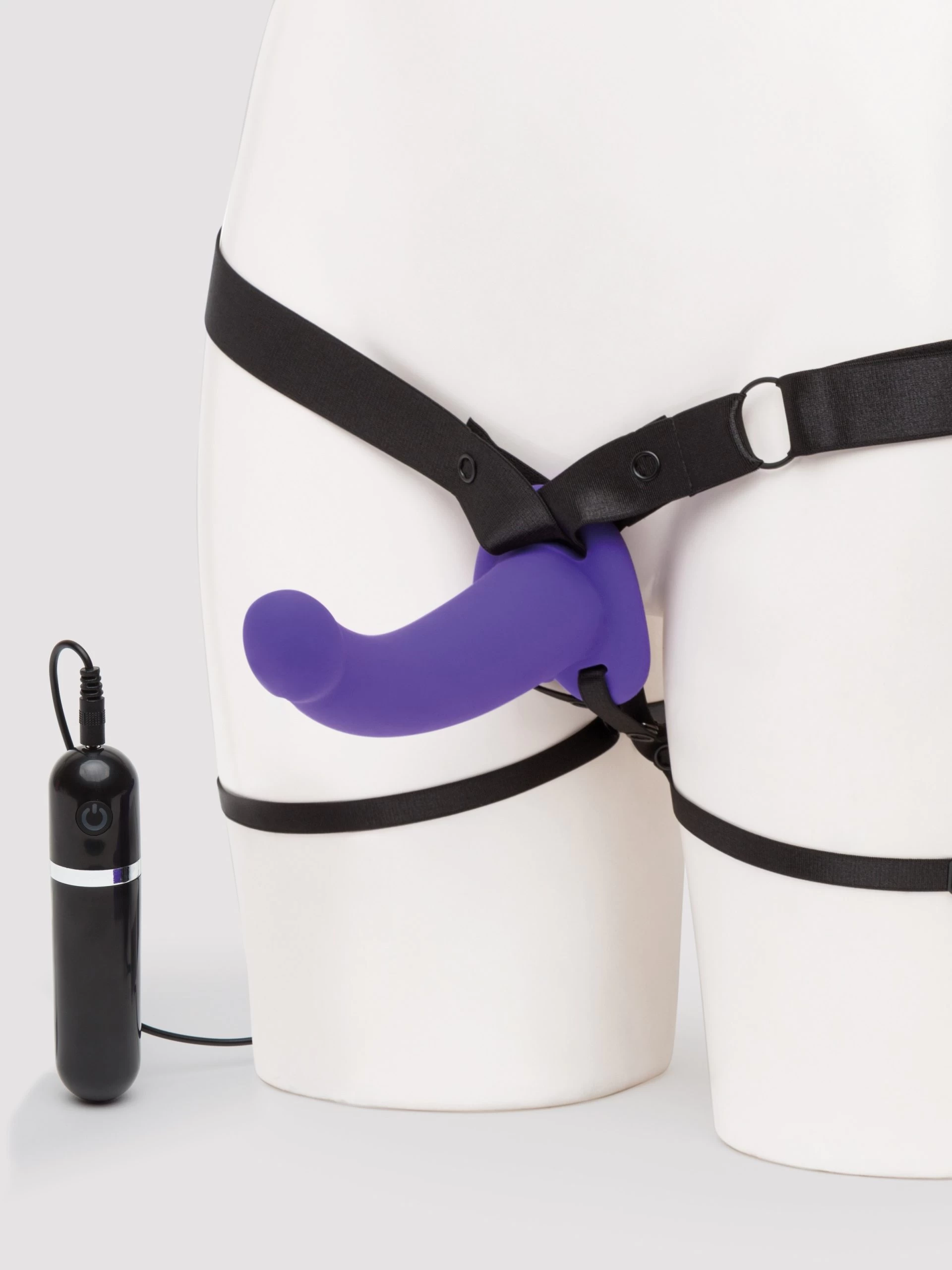 - Vibrating double-ended dildo and strap-on harness set for pegging and strap-on play