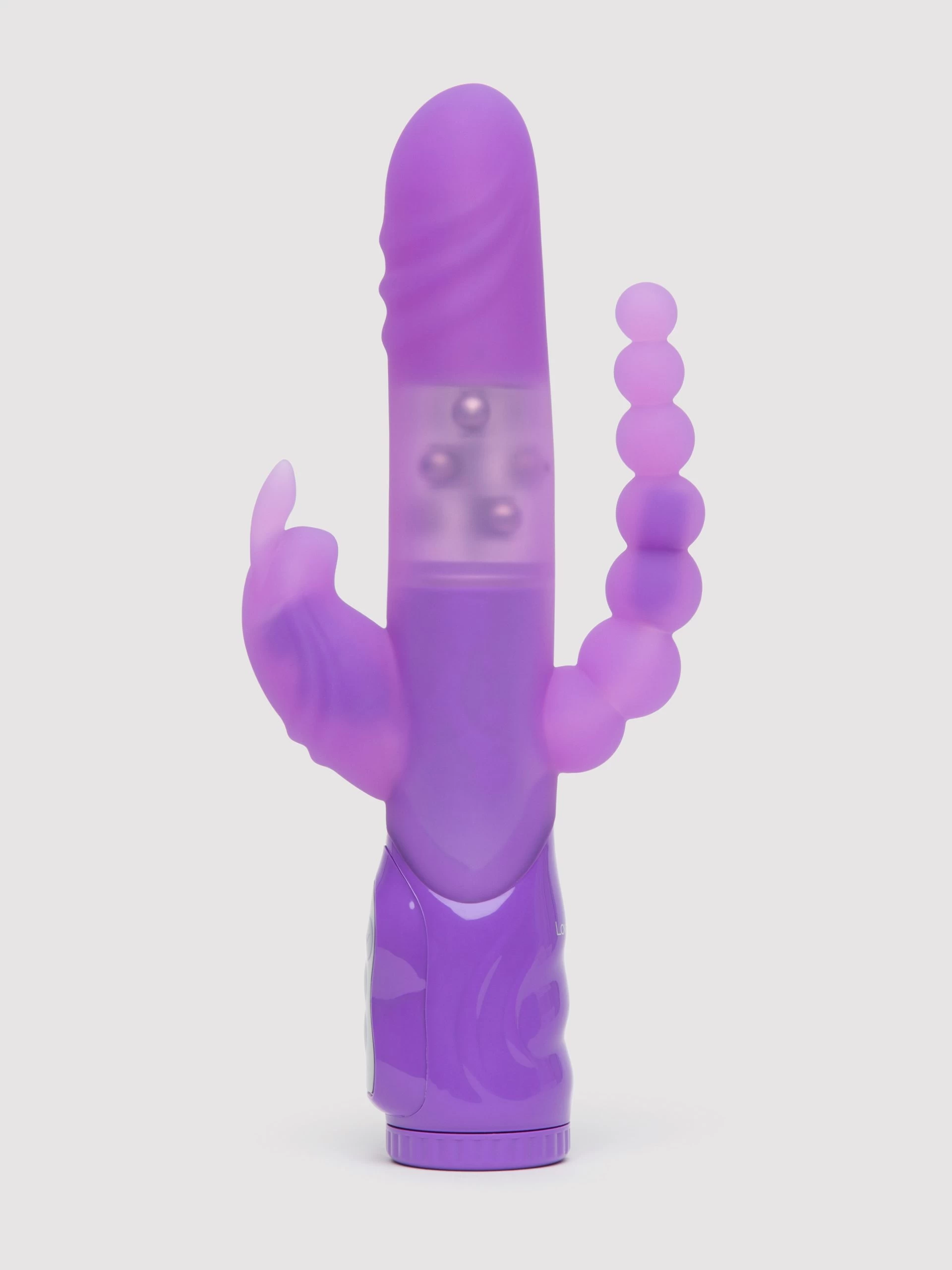A sublime trinity of simultaneous stimulation that’s a dream within a dream within a dream. Soft bunny ears and a beaded prober shake your clitoris and bot, while a reversible rotating shaft provides the delicious filling of your solo pleasure sandwich.