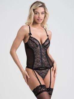 With the curvaceous use of overlaid lace panels at the front, and contrasting sheer mesh panels to both sides, this sculpted and fitted bustier set will perfectly showcase your hourglass silhouette.