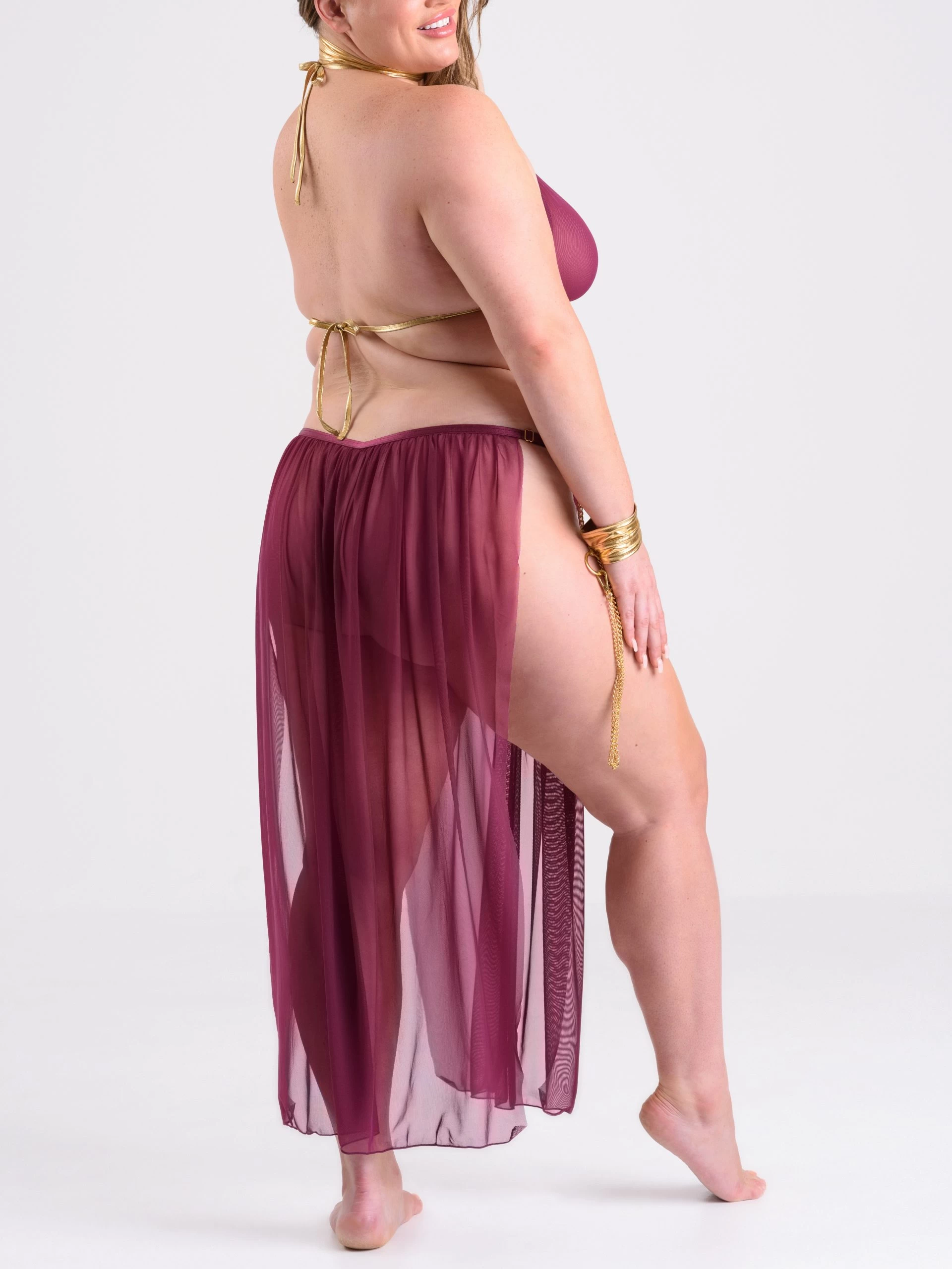 IGet a guaranteed captive audience with this desert princess prisoner costume. Enjoy the semi-sheer halterneck bra with gold lamé ties and sheer side-split skirt attached to a gold lamé thong, with golden O-rings, matching collar, wrist cuffs and chains.