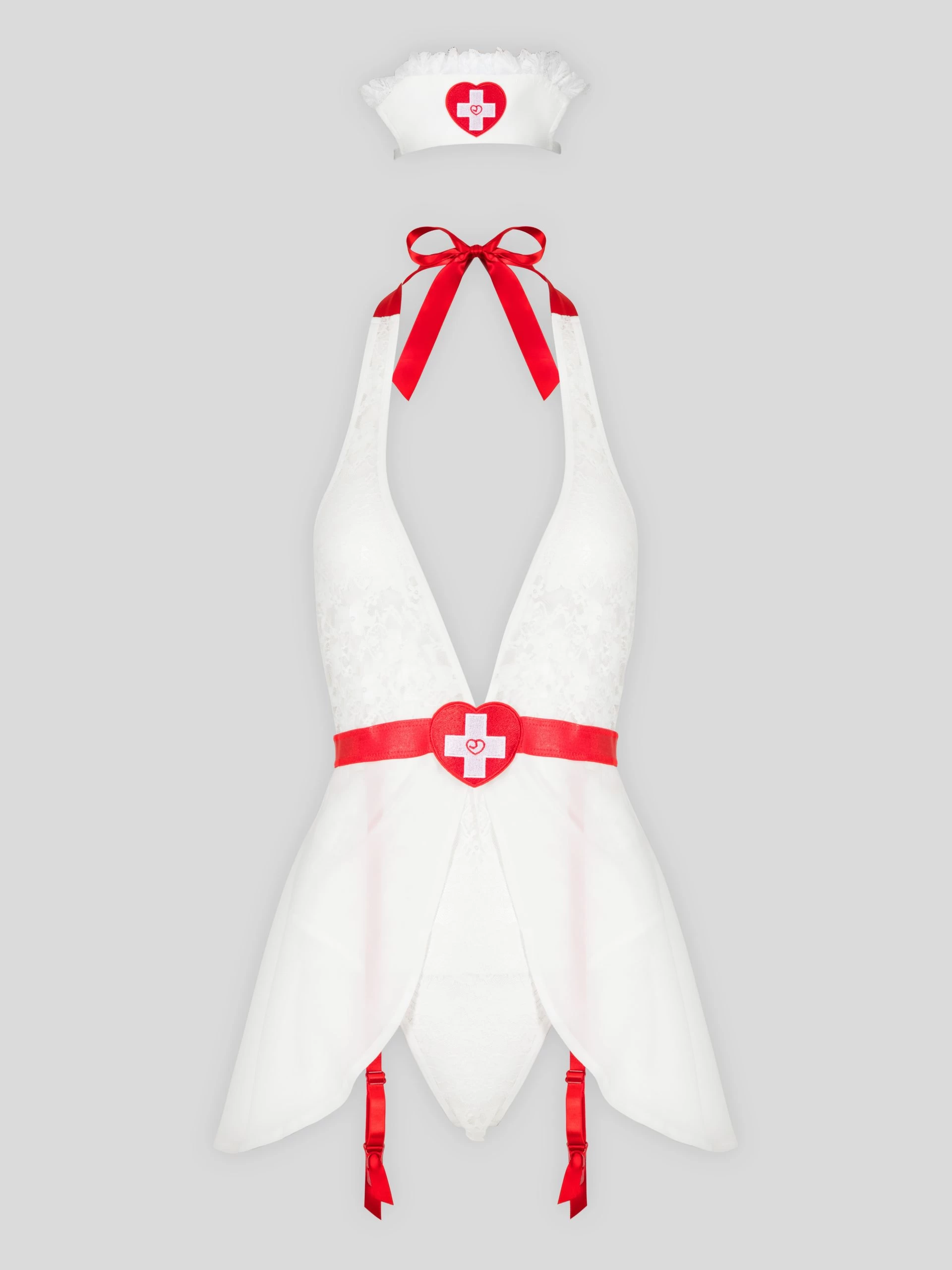 Each set features an open-back body with garter straps, and a matching nurse’s cap to finish the look.