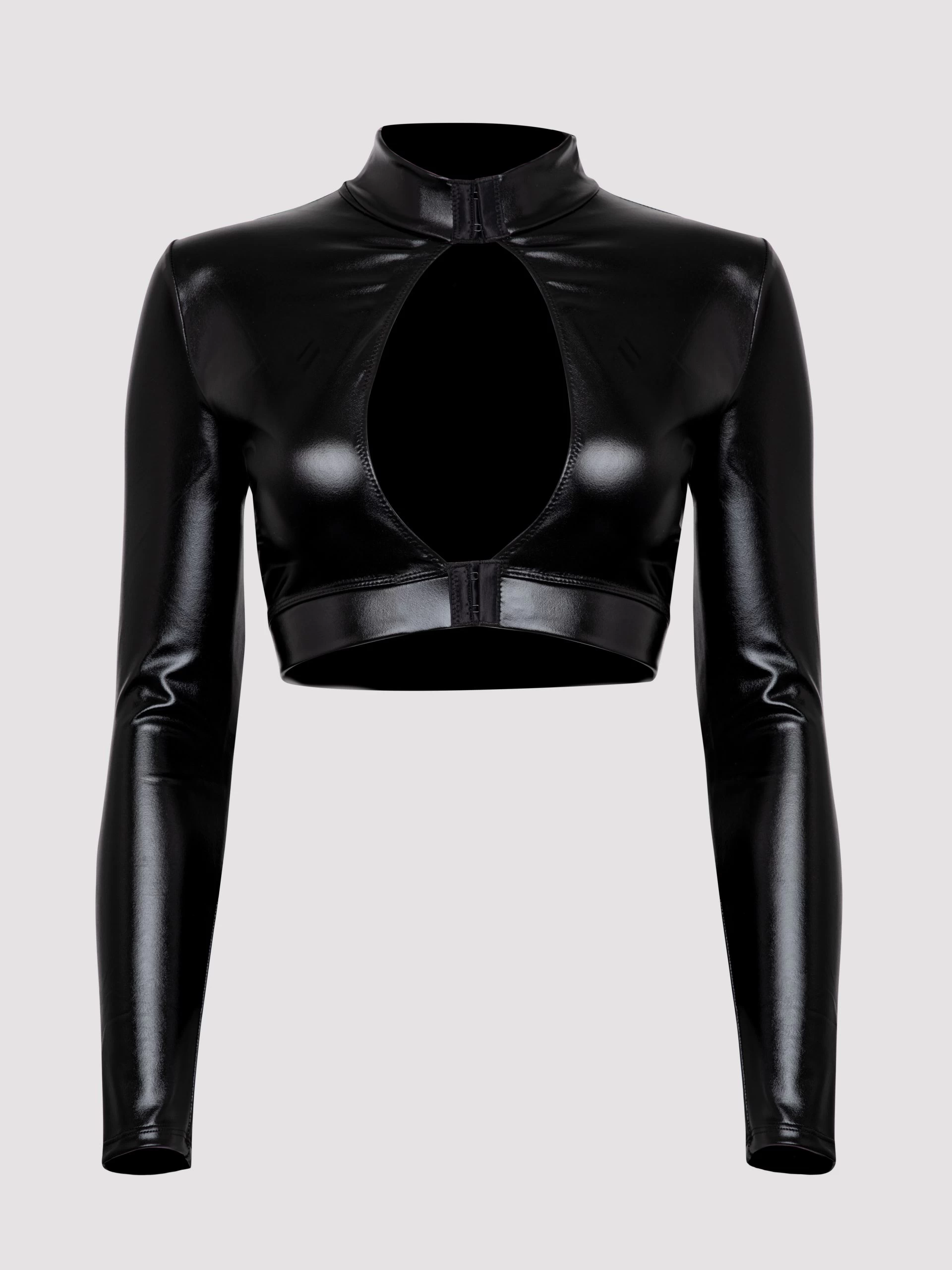 - Wet look, long sleeve cut-out crop top for a provocative and daring look