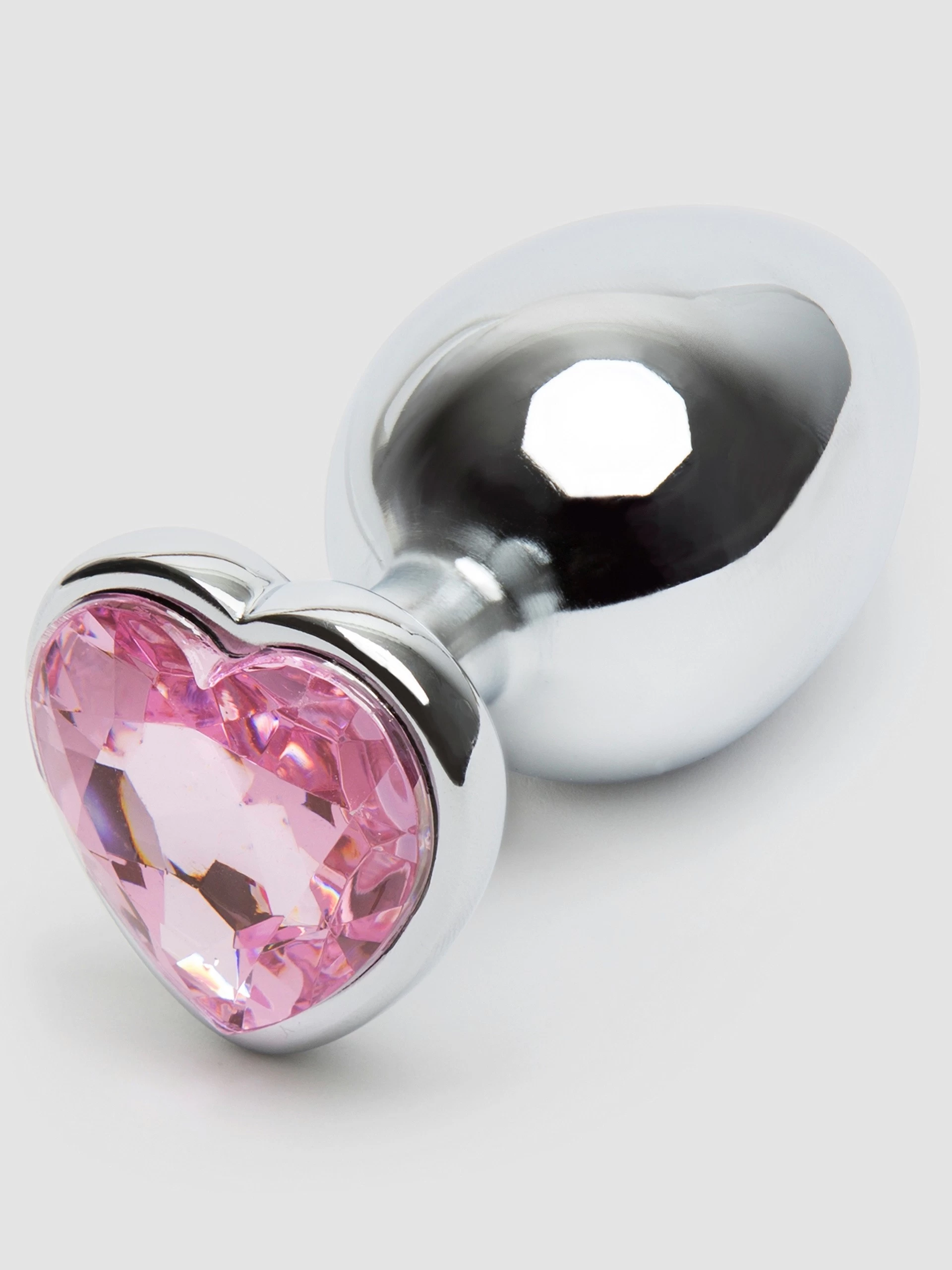 - Smooth metal butt plug with jeweled heart-shaped base for firm, filling sensations
