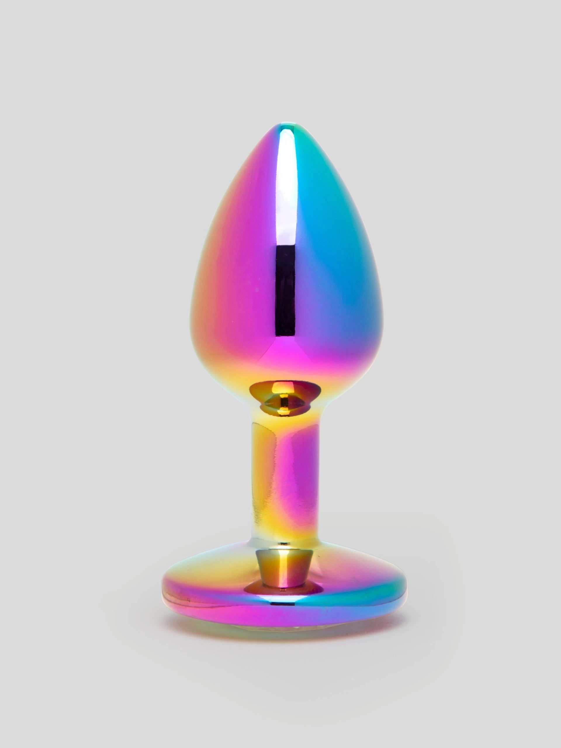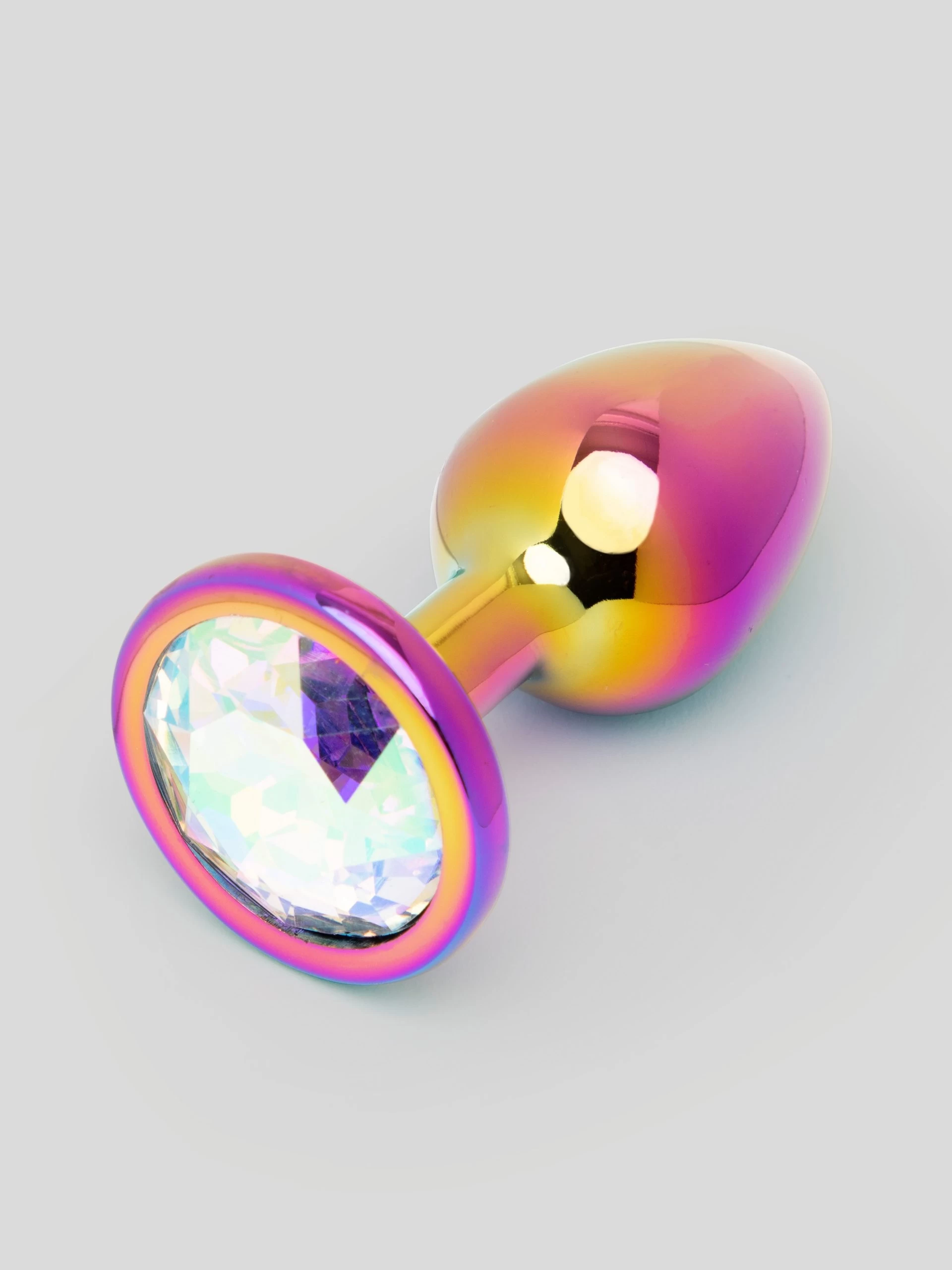 - Smooth iridescent zinc alloy butt plug with jeweled base for firm, filling sensations