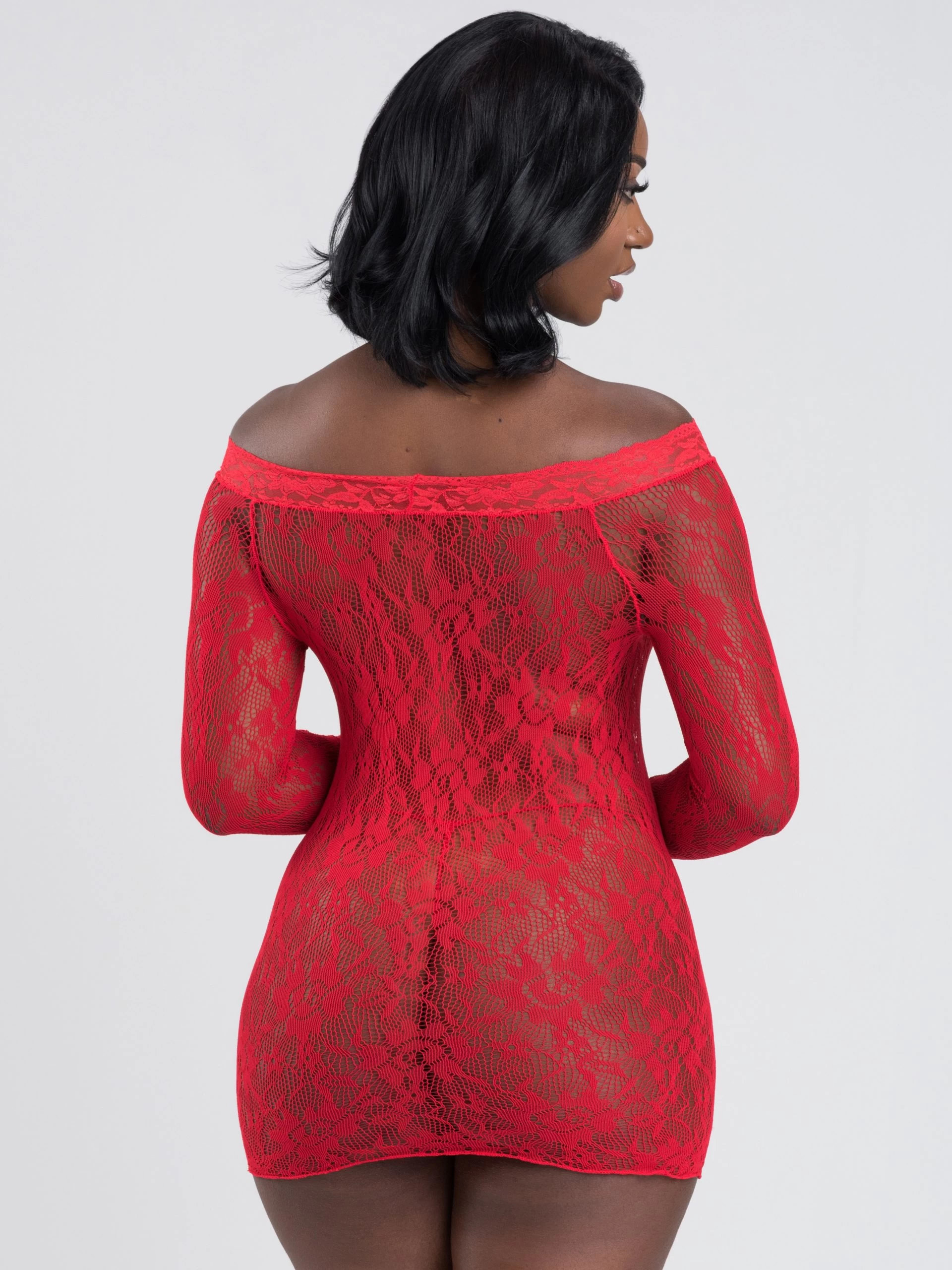 - Red floral lace off-the-shoulder dress with matching G-string for elegant seduction