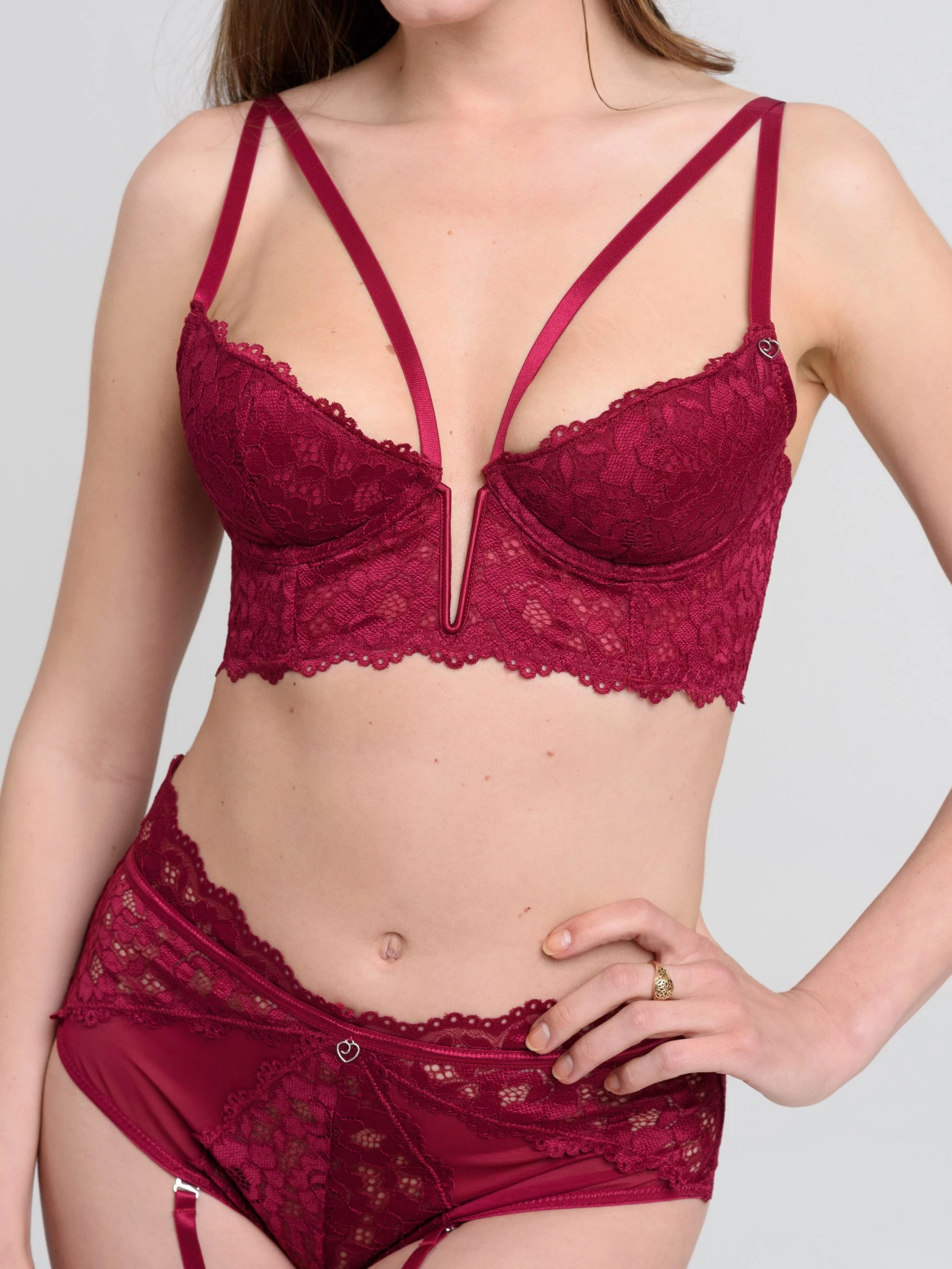 Match your lingerie to your vino and let your lover drink in your curves in this mouthwatering burgundy set. Made from floral lace and irresistibly sheer mesh, with a V line plunge and high-waisted thong, this delicious duo will have them drunk in love.