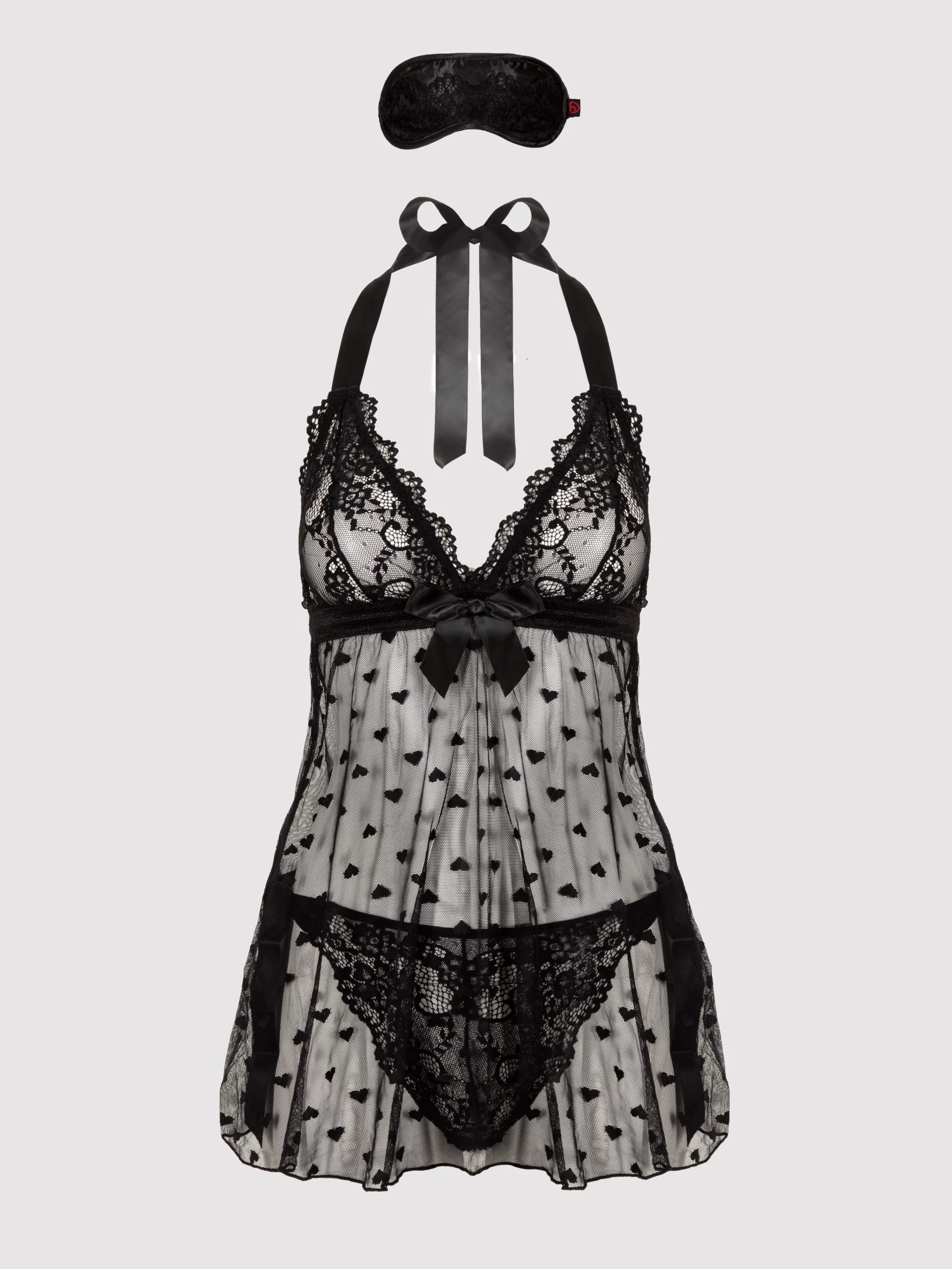 Skip the stress of separate sizes and bestow your beloved with the gift of gorgeous, curve-skimming lingerie that fits. Containing a beautiful halterneck, black lace babydoll and tie-side lace panties, along with a gift envelope, it’s a one-size wonder.