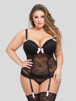 - Plus size figure-hugging lace basque set with adjustable hook-and-eye for perfect fit
