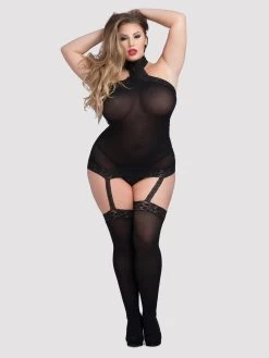 - Plus size, black one-piece sheer bodystocking with lace detail