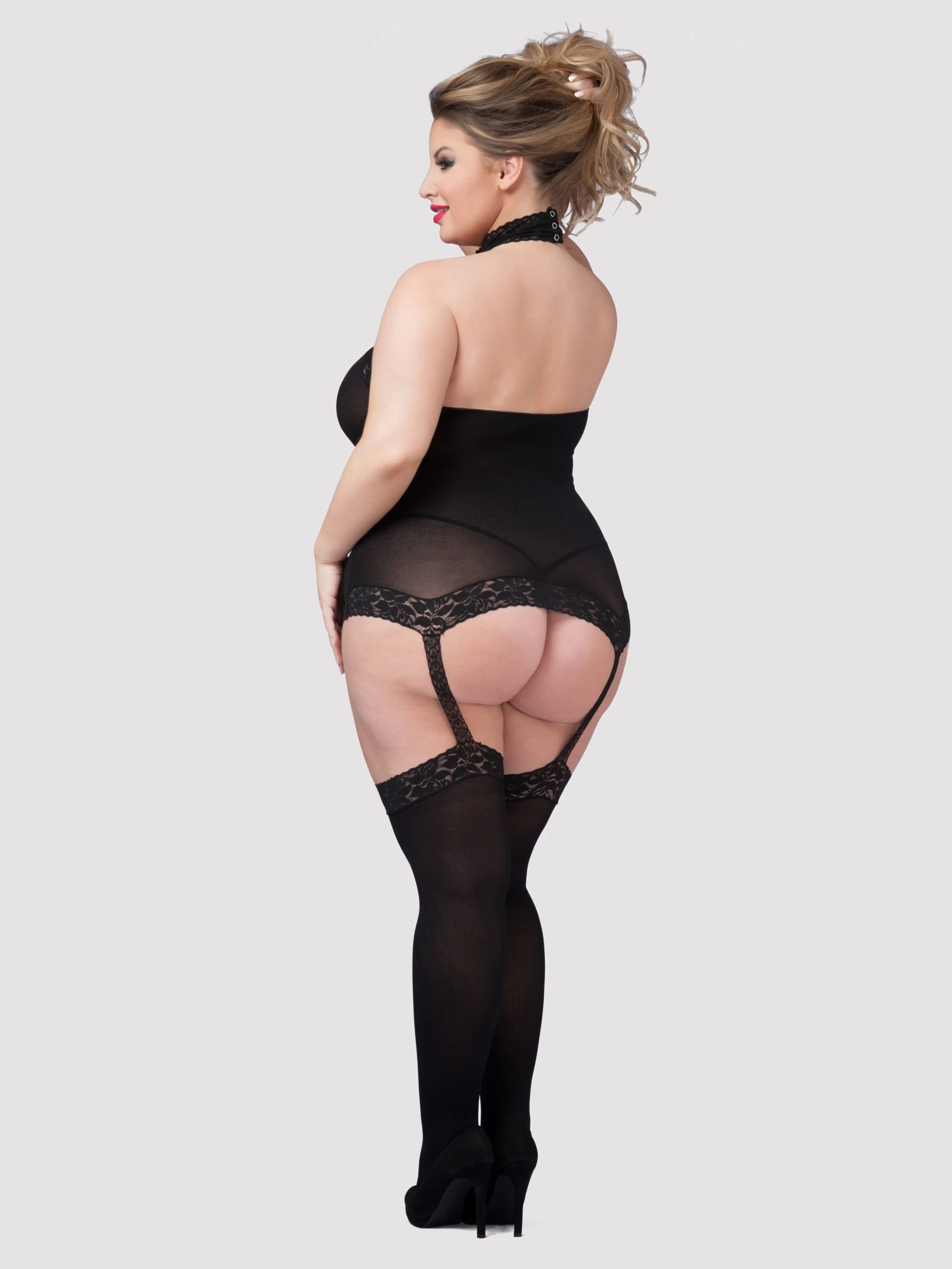 Have you discovered the figure-flattering powers of an all-in-one yet? If not, it’s high time you slipped into this sheer black dress and stockings combo. Trimmed with floral lace for a suspender-style look, you’ll love its confidence-boosting shape.