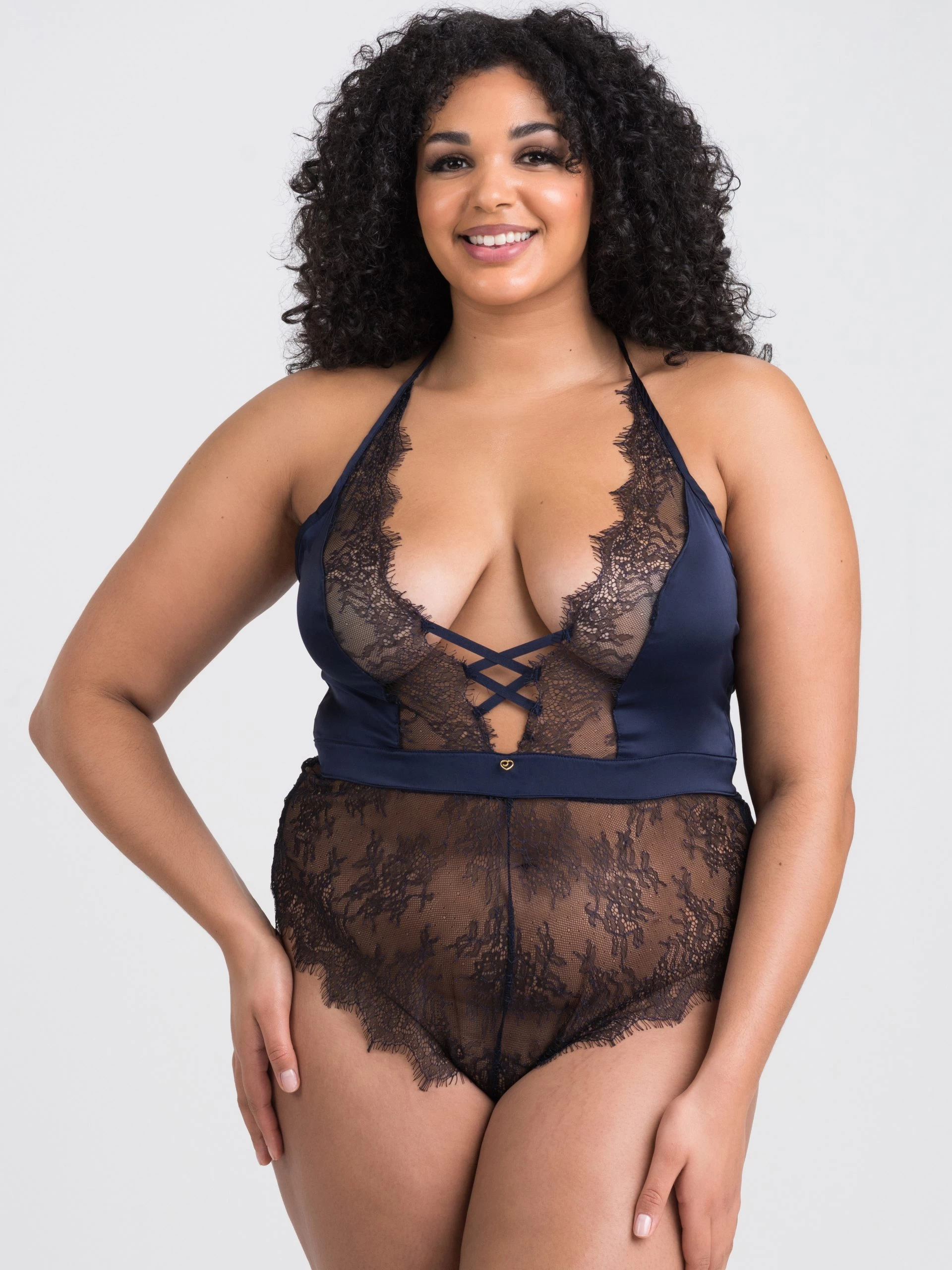 Envelop your curves in soft, sheer lace and satin with this midnight-blue teddy from our Dark Orchid collection. A defined, plunging neckline with criss-cross detailing delicately dresses your décolletage and draws all eyes center stage.