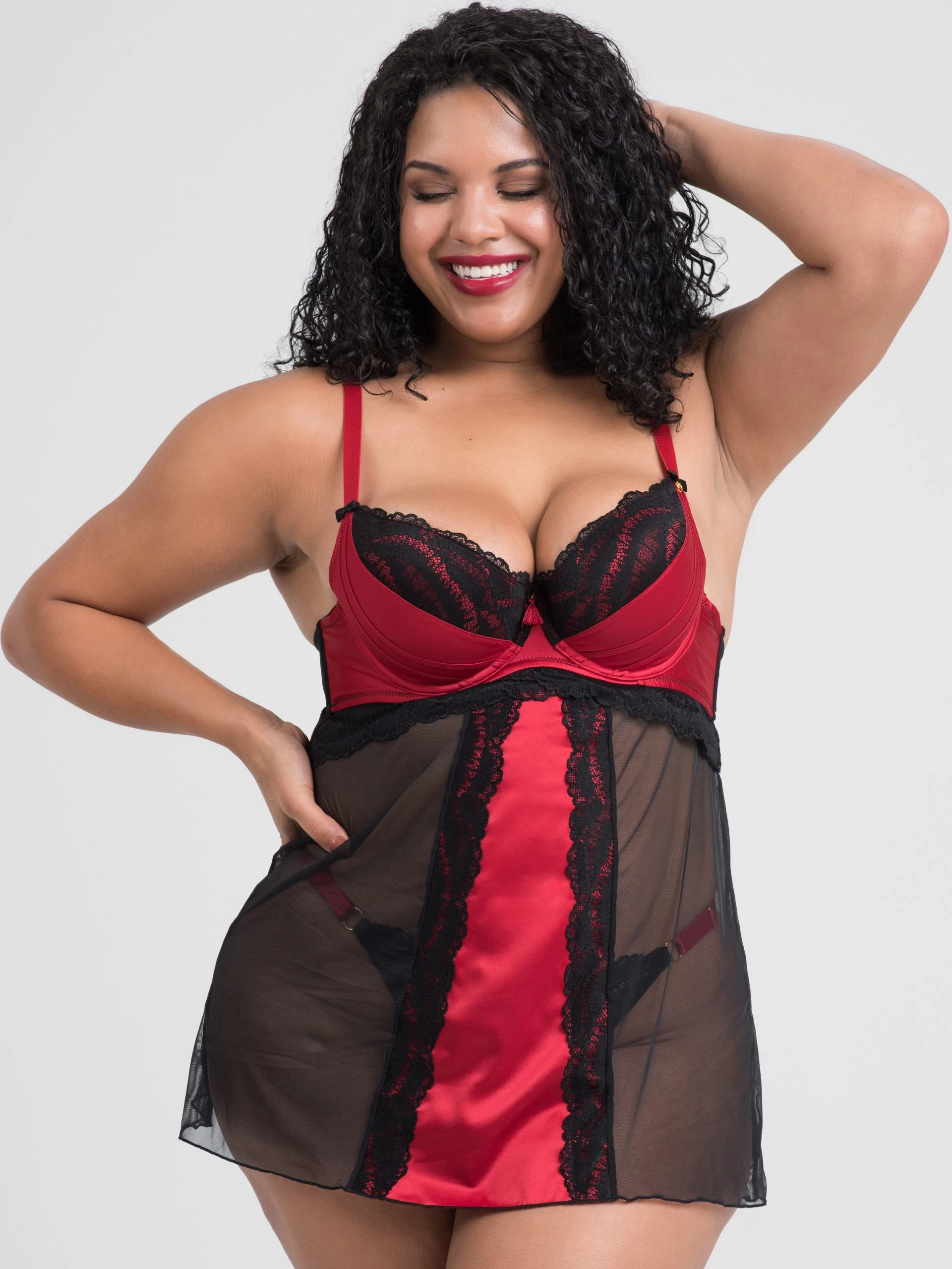 This sizzling chemise flatters your figure by enhancing your best bits. While the bright red satin attracts the eye to your narrowest point, sheer black mesh gives the illusion of an hourglass shape.