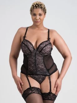 With the curvaceous use of overlaid lace panels at the front, and contrasting sheer mesh panels to both sides, this sculpted and fitted bustier set will perfectly showcase your hourglass silhouette.