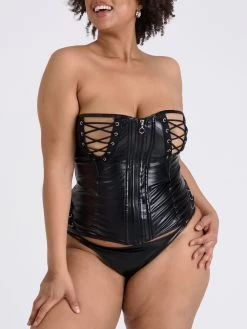 Throw some sizzling shapes in this leather-look bustier set from our Fierce collection. Featuring tantalizing corset-style lacing over your breasts, back and hips, a zipper to the front and steel boning to cinch your waist, this set is sure to thrill.