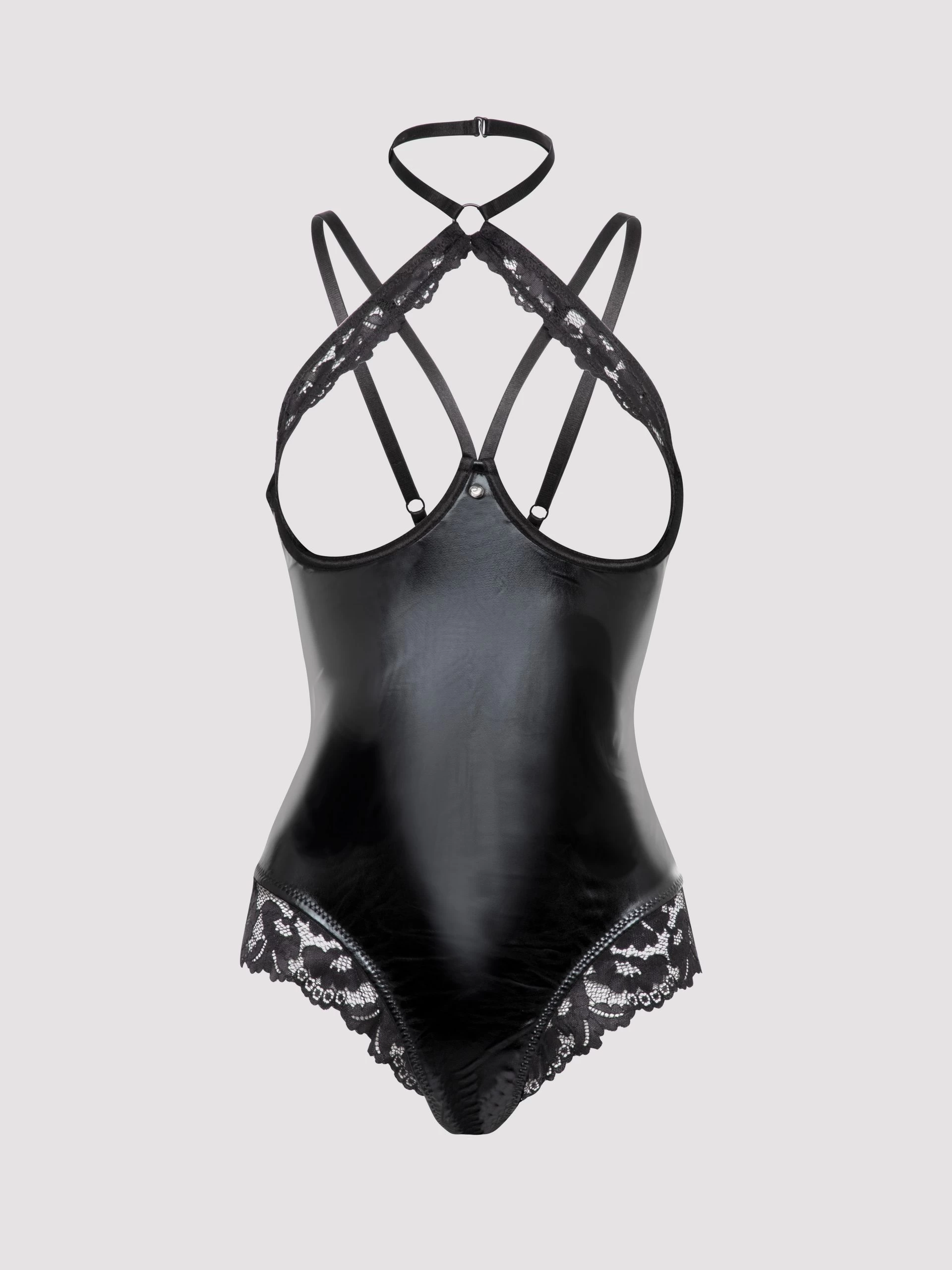 Boasting six adjustment points in total, this super-stretchy wet look fabric clings to your curves and flatters your every inch. To the rear, a tempting combination of straps leaves your back and butt touchably exposed, while the open crotch ensures easy access when the fire runs hot.