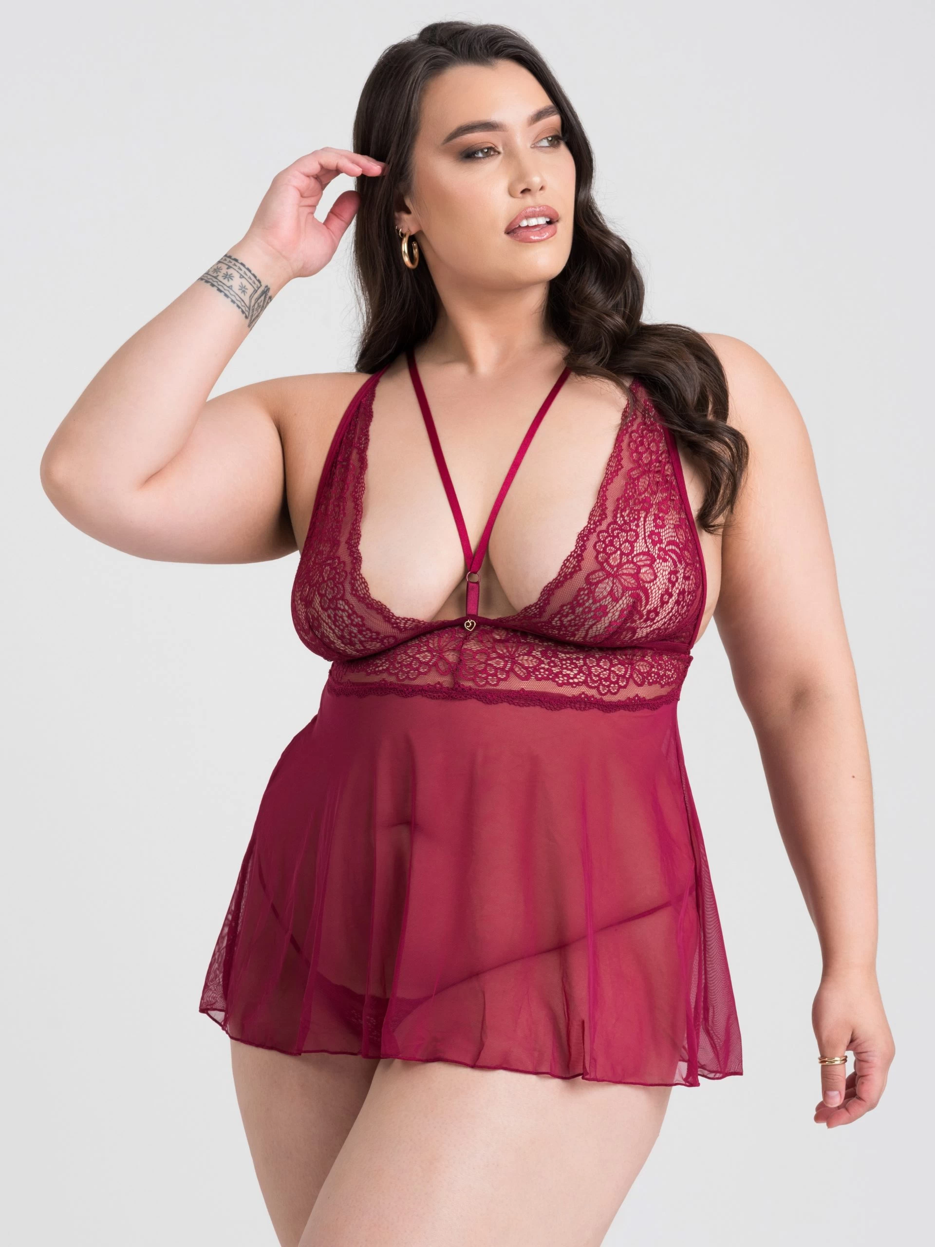 - Barely there plus size sheer mesh babydoll set with plunging soft lace cups