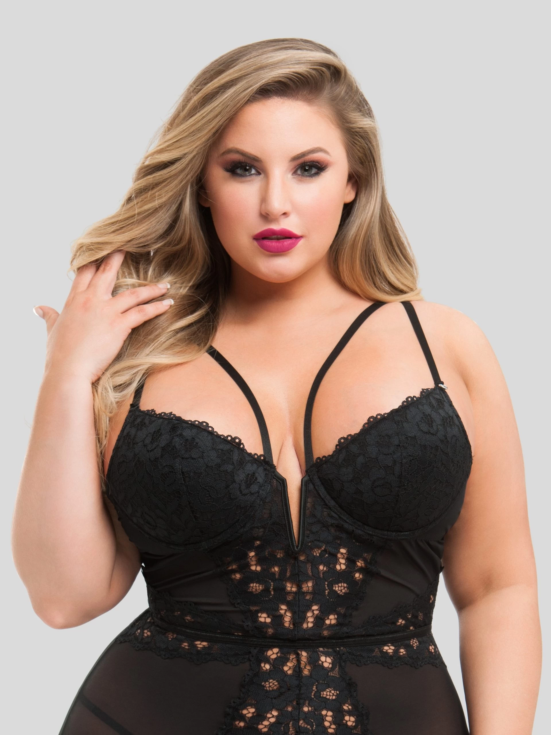 Made from jet black mesh and lace, with contoured lace panels creating enviable hourglass proportions, this is the perfect look for a long, sensual soirée.