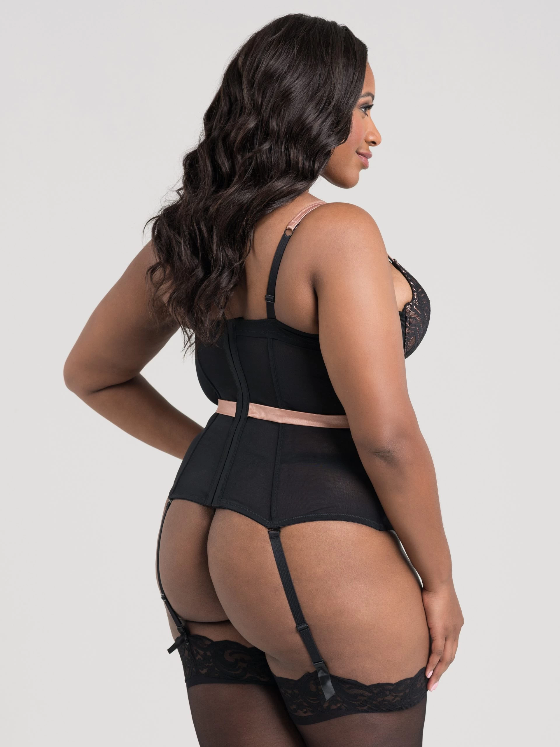 Boned panels, black power mesh sides and a leatherette belt sculpt a stunning hourglass silhouette, while lightly padded, plunging underwired cups create an enviable cleavage.