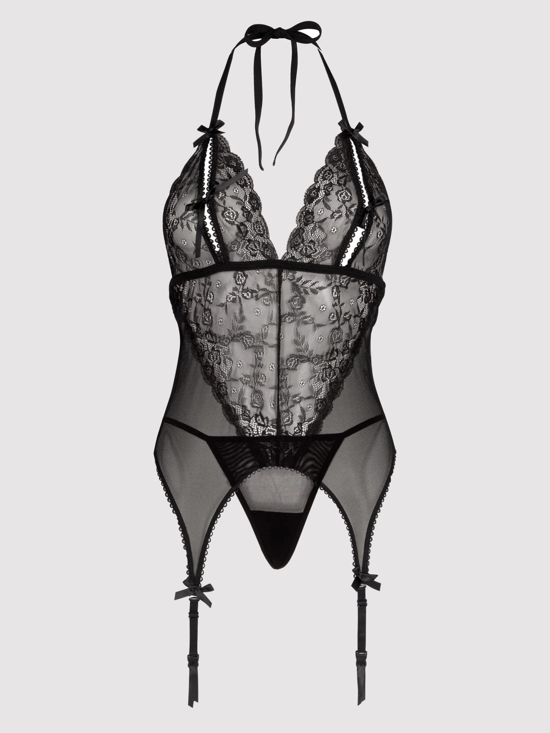 Made from soft, stretchy materials that hug your curves, the bustier can be tweaked to fit using the tie-up halterneck and adjustable underbust band at the rear. At the hemline, the 4 suspender straps can be worn with your choice of stockings for top-to-toe sex appeal.