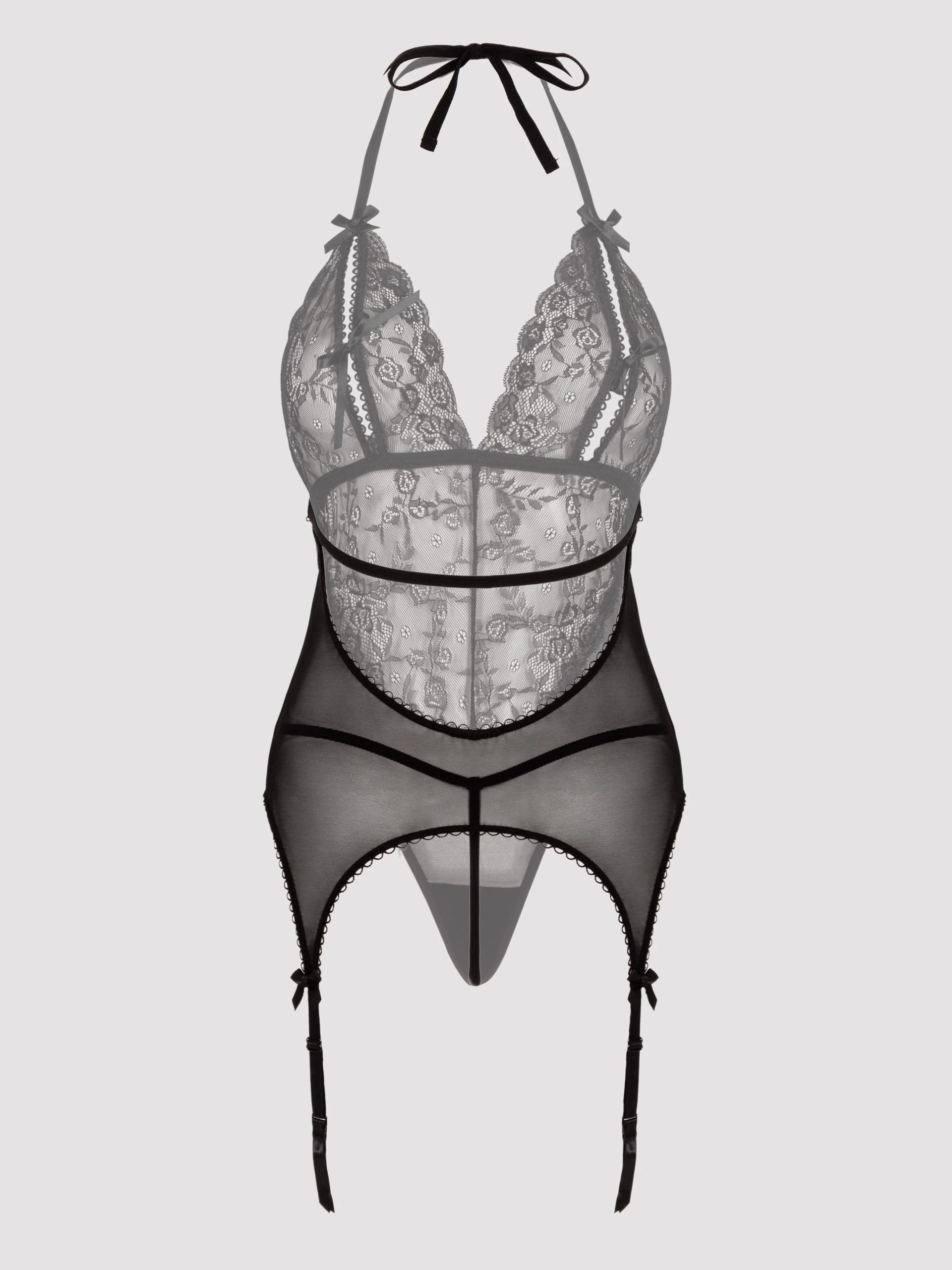 - Lace and mesh bustier set with peek-a-boo cups and garter straps for classic seductive style