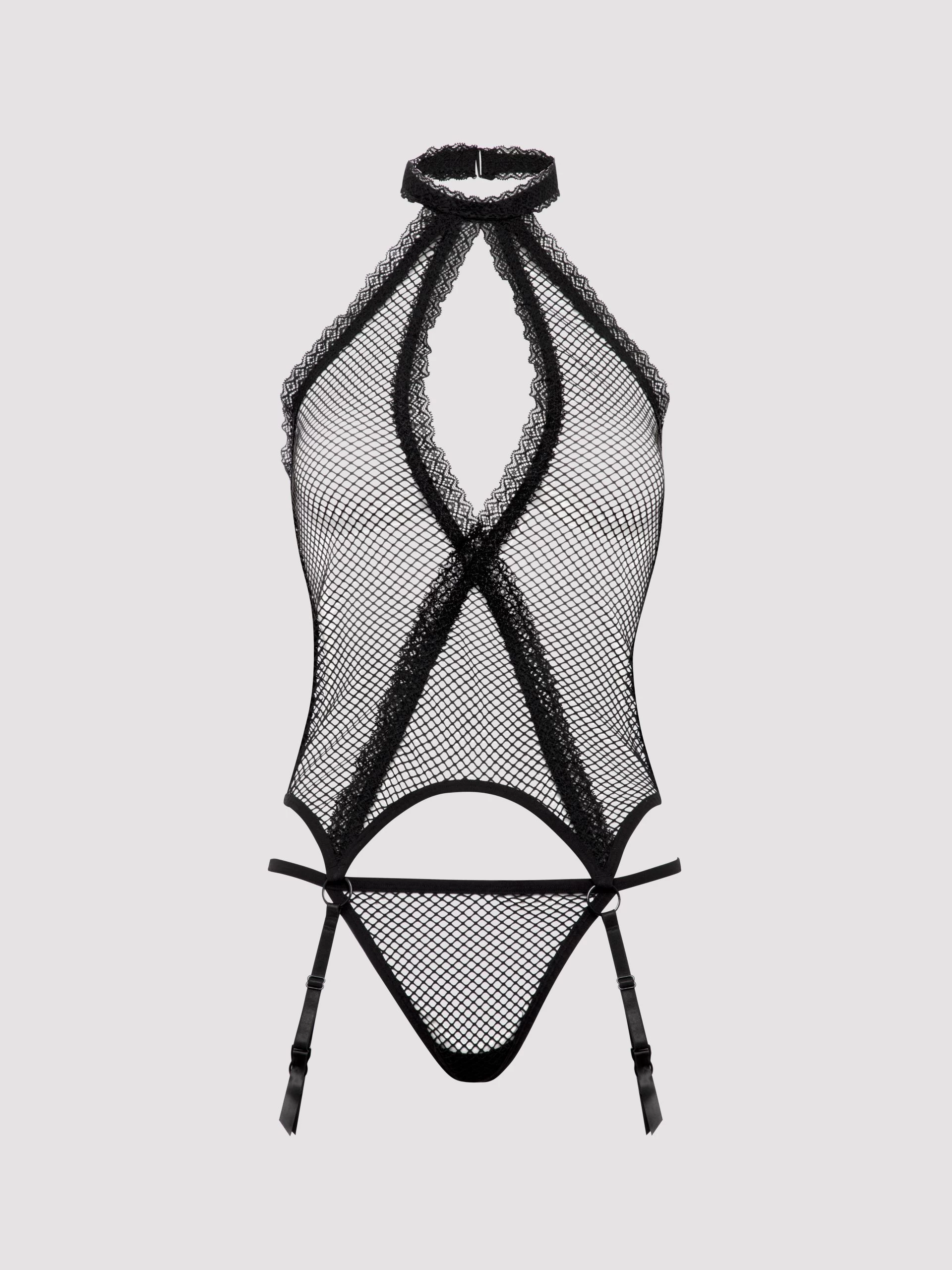 - Fishnet and lace bustier with garters and matching G-string for a breathtakingly sexy look