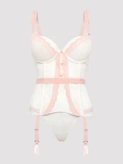Get chests heaving with this Regency-inspired basque set. Formed in elegant ivory lace with soft pink detailing, this gorgeous set balances beguiling femininity with red-hot sex appeal. Pair with gloves and stockings to really bring the fantasy to life.