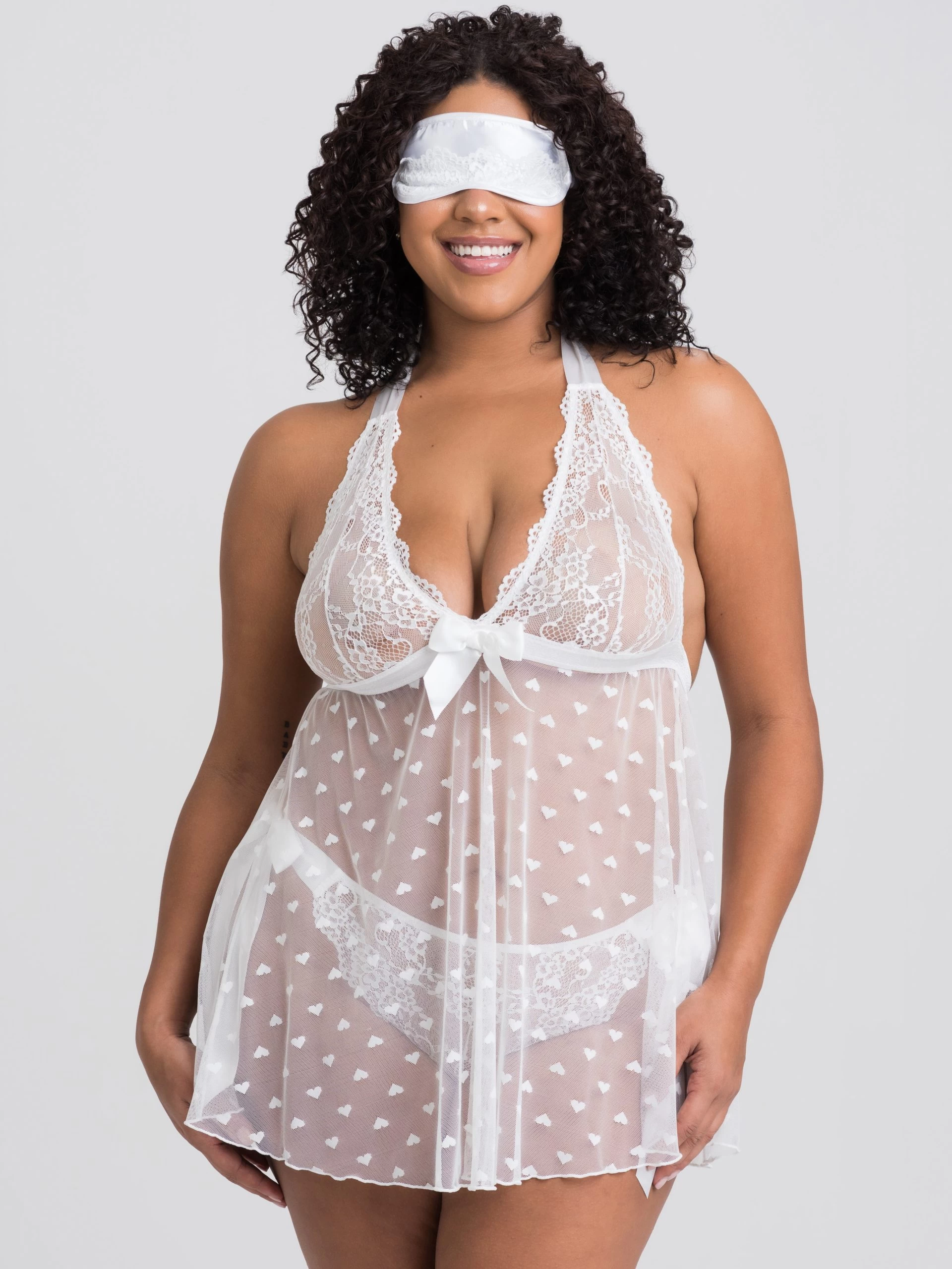 - Lace lingerie set including a babydoll, panties and eye mask for fun nights in