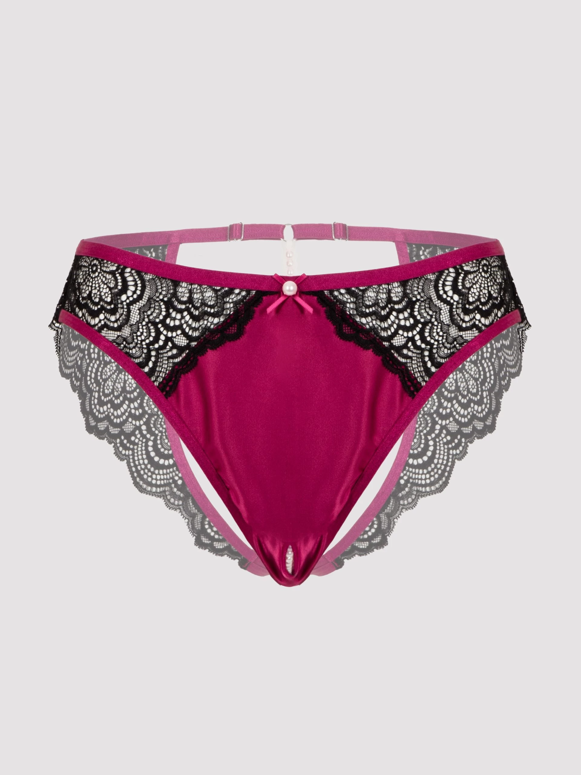 - Satin and lace open-back panties with pearl-like beads across the gusset for sensational stimulation