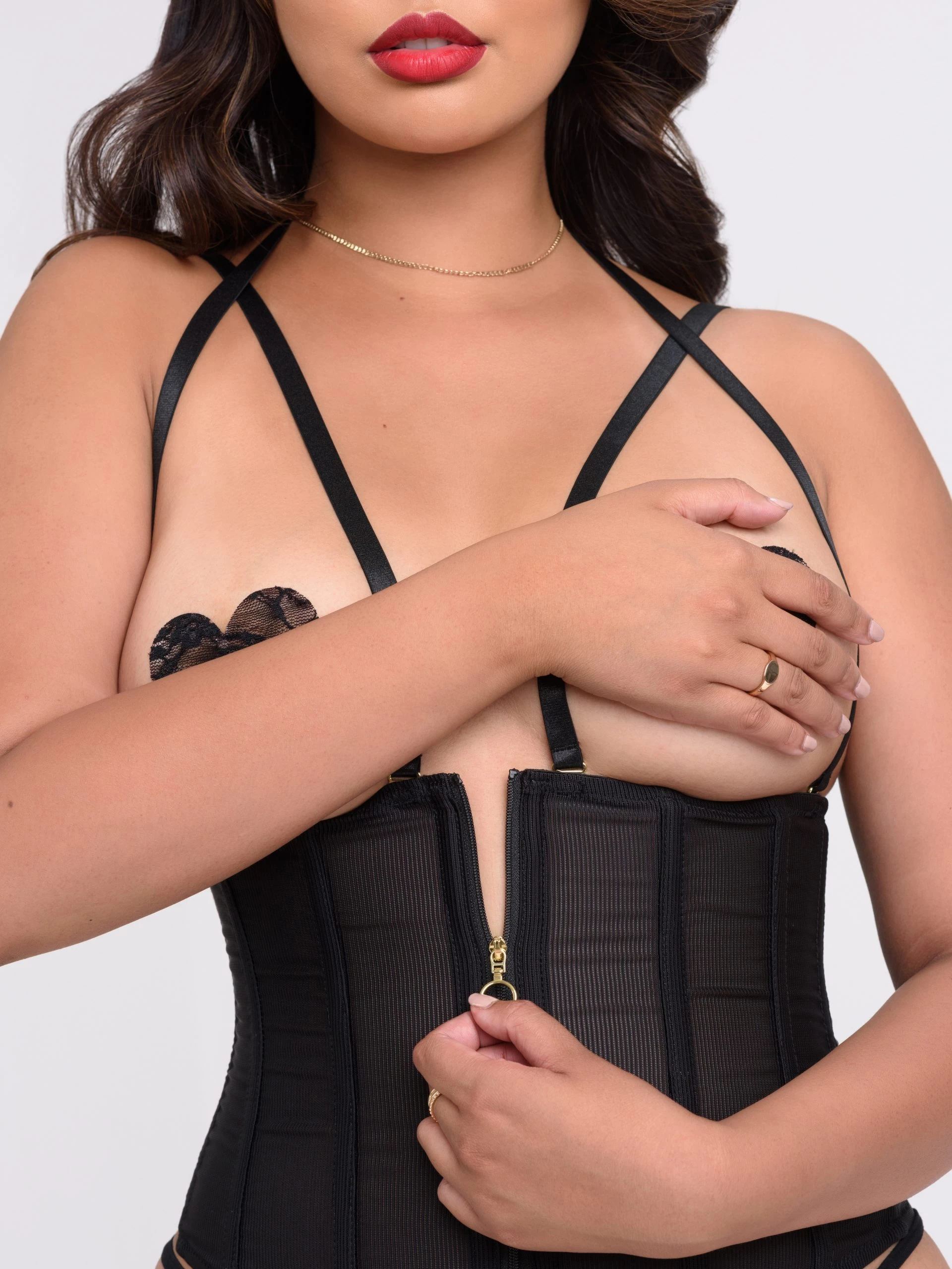- Stunning steel-boned waspie with front zipper for waist-defining seduction