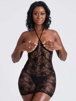 Not for the faint-hearted, this scandalously sexy dress is sure to cause a stir. Featuring a booty-baring back, sheer stretch lace and a tie-up neck, this slinky LBD slips off lickety-split. We dare your lover to try to ignore this little number.