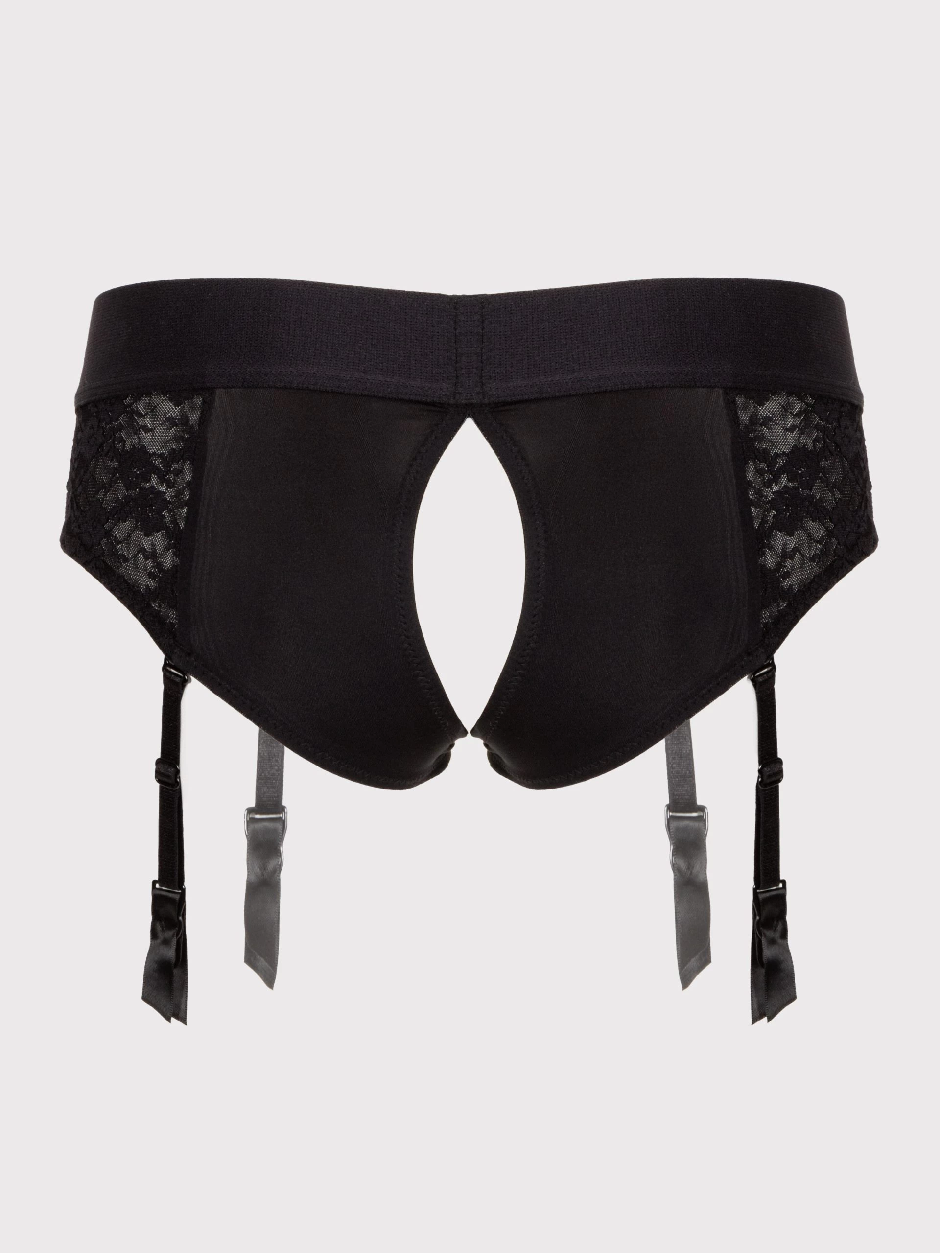Peg in effortless style with these flirty harness briefs, and discover your sensual strap-on adventures. Crotchless, and with an open back for easy access and enhanced mutual pleasure, the only straps around here are the suspenders.