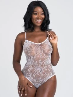- Flirty floral white lace bodysuit with racer back and open crotch to highlight your curves