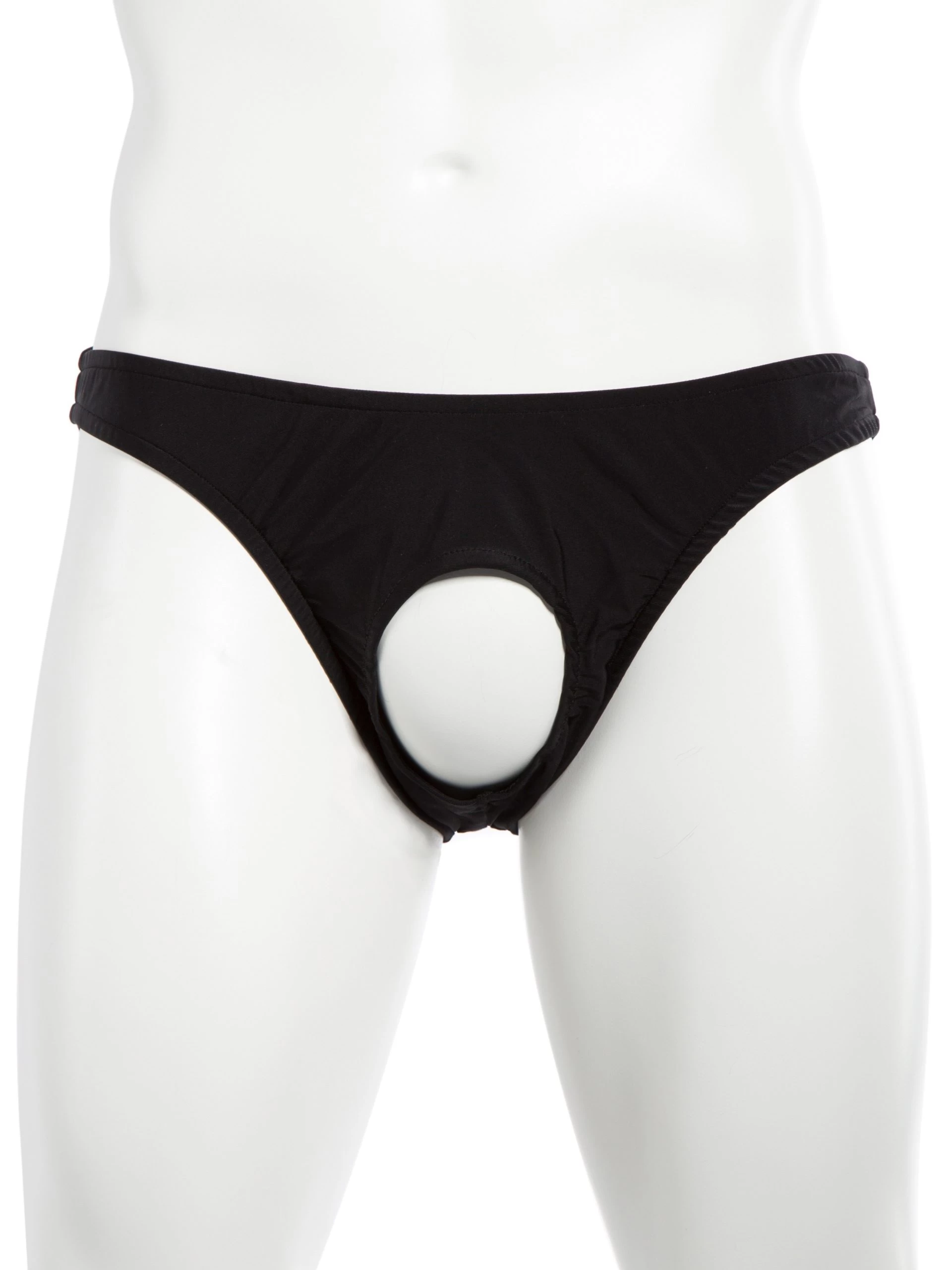 My, oh my. Though they may look just like your standard tight black briefs from behind, these stretchy, sexy briefs have a bold open front that frames your fellows to perfection. Pop them on under jeans and surprise your partner with a slow, sexy reveal.