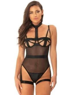 - Underwired strappy teddy with removable harness and garters