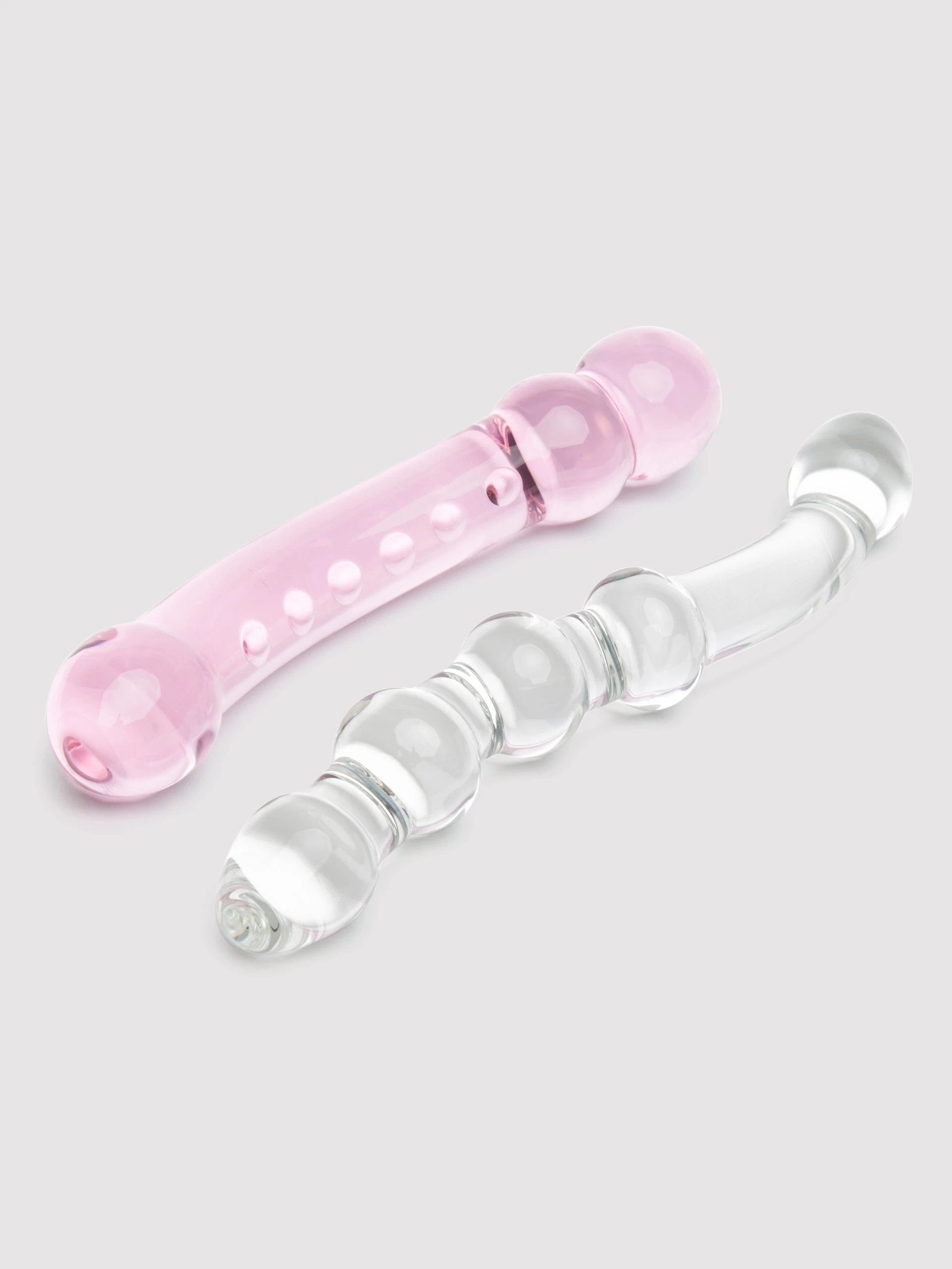 The pink dildo is lightly curved, featuring nodules along the shaft and different bulbed tips at either end for added stimulation. The clear glass dildo curves in a gentle ‘S’ shape, perfect for massaging your G or P spot. One end of the shaft is deliciously ribbed for intensified sensations, while tapered bulbs at either end off satisfying stimulation.